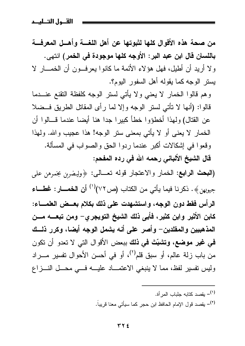 (البحث الرابع: الخمار والاعتجار قوله تعالى: {وليضربن بخمرهن على جيوبهن}. ذكرنا فيما يأتي من الكتاب (ص 72) (¬1) أن الخمار: غطاء الرأس فقط دون الوجه، واستشهدت على ذلك بكلام بعض العلماء: كابن الأثير وابن كثير، فأبى ذلك الشيخ التويجري- ومن تبعه من المذهبيين والمقلدين- وأصر على أنه يشمل الوجه أيضا، وكرر ذلك في غير موضع، وتشبّث في ذلك ببعض الأقوال التي لا تعدو أن تكون من باب زلة عالم، أو سبق قلم (¬2)، أو في أحسن الأحوال تفسير مراد وليس تفسير لفظ، مما لا ينبغي الاعتماد عليه في محل النزاع