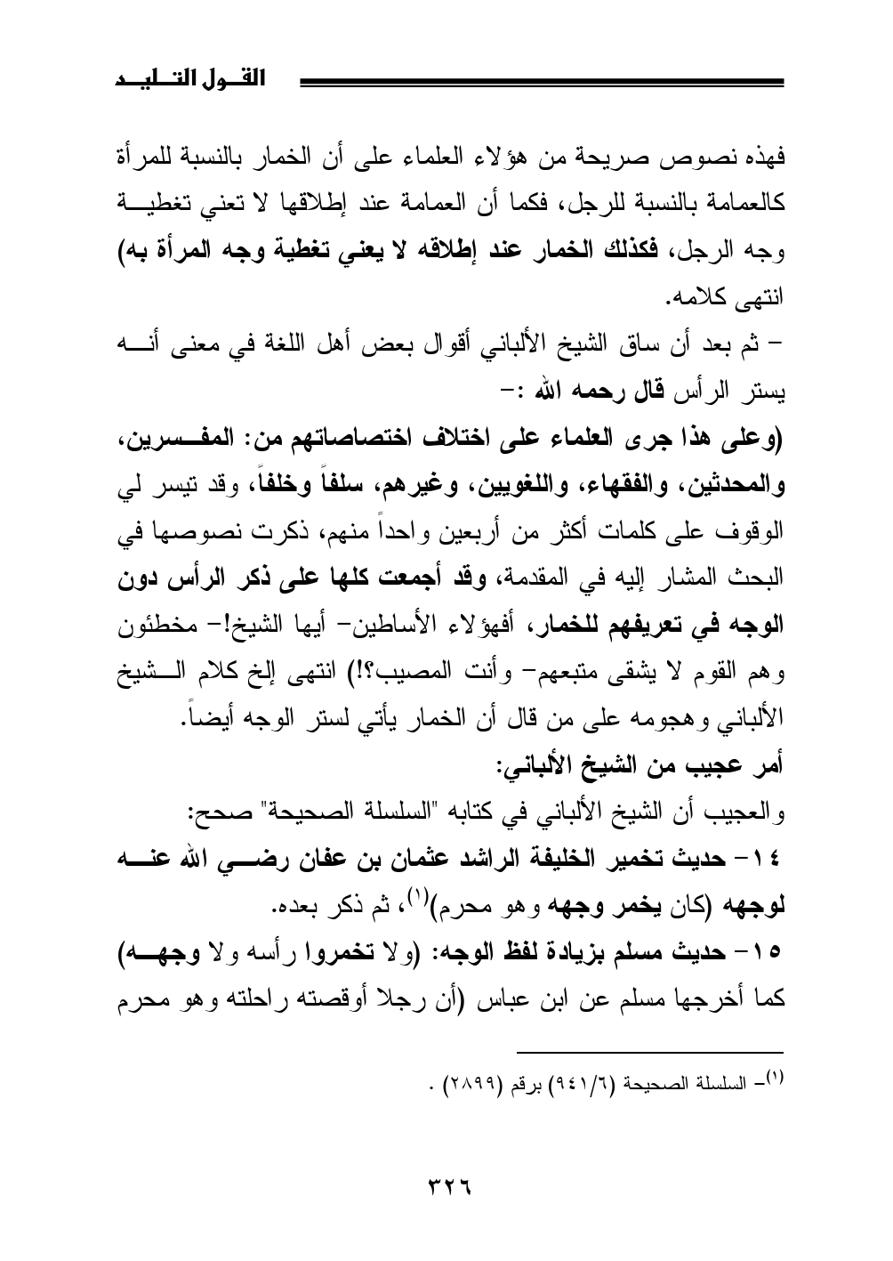 (وعلى هذا جرى العلماء على اختلاف اختصاصاتهم من: المفسرين، والمحدثين، والفقهاء، واللغويين، وغيرهم، سلفاً وخلفاً، وقد تيسر لي الوقوف على كلمات أكثر من أربعين واحداً منهم، ذكرت نصوصها في البحث المشار إليه في المقدمة، وقد أجمعت كلها على ذكر الرأس دون الوجه في تعريفهم للخمار، أفهؤلاء الأساطين- أيها الشيخ! - مخطئون وهم القوم لا يشقى متبعهم- وأنت المصيب؟ ! ) انتهى إلخ كلام الشيخ الألباني وهجومه على من قال أن الخمار يأتي لستر الوجه أيضاً.
