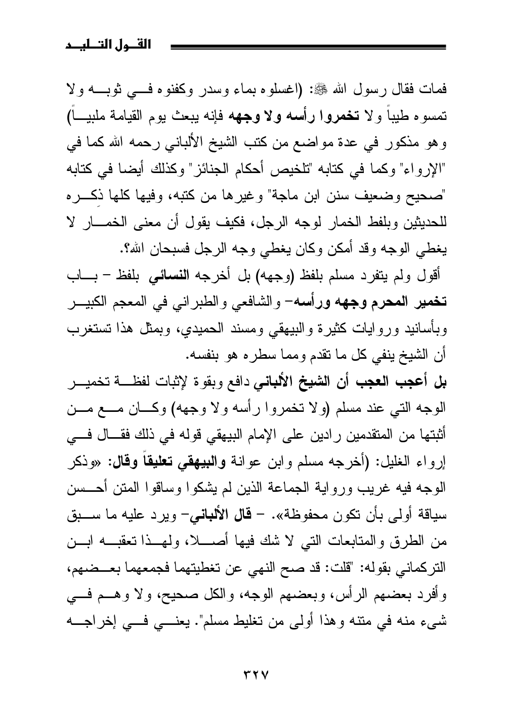 بل أعجب العجب أن الشيخ الألباني دافع وبقوة لإثبات لفظة تخمير الوجه التي عند مسلم (ولا تخمروا رأسه ولا وجهه) وكان مع من أثبتها من المتقدمين رادين على الإمام البيهقي قوله في ذلك فقال في إرواء الغليل: (أخرجه مسلم وابن عوانة والبيهقي تعليقاً وقال: «وذكر الوجه فيه غريب ورواية الجماعة الذين لم يشكوا وساقوا المتن أحسن سياقة أولى بأن تكون محفوظة». - قال الألباني- ويرد عليه ما سبق من الطرق والمتابعات التي لا شك فيها أصلا، ولهذا تعقبه ابن التركماني بقوله: "قلت: قد صح النهي عن تغطيتهما فجمعهما بعضهم، وأفرد بعضهم الرأس، وبعضهم الوجه، والكل صحيح، ولا وهم في شاء منه في متنه وهذا أولى من تغليط مسلم". يعني في إخراجه