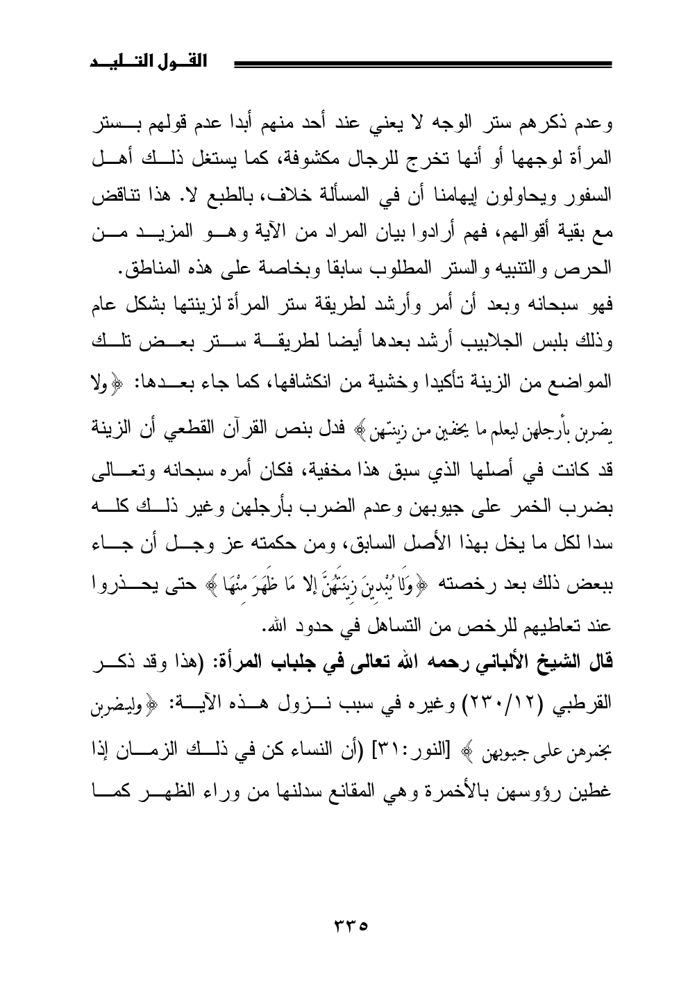 قال الشيخ الألباني رحمه الله تعالى في جلباب المرأة: (هذا وقد ذكر القرطبي (12/ 230) وغيره في سبب نزول هذه الآية: {وليضربن بخمرهن على جيوبهن} [النور: 31] (أن النساء كن في ذلك الزمان إذا غطين رؤوسهن بالأخمرة وهي المقانع سدلنها من وراء الظهر كما