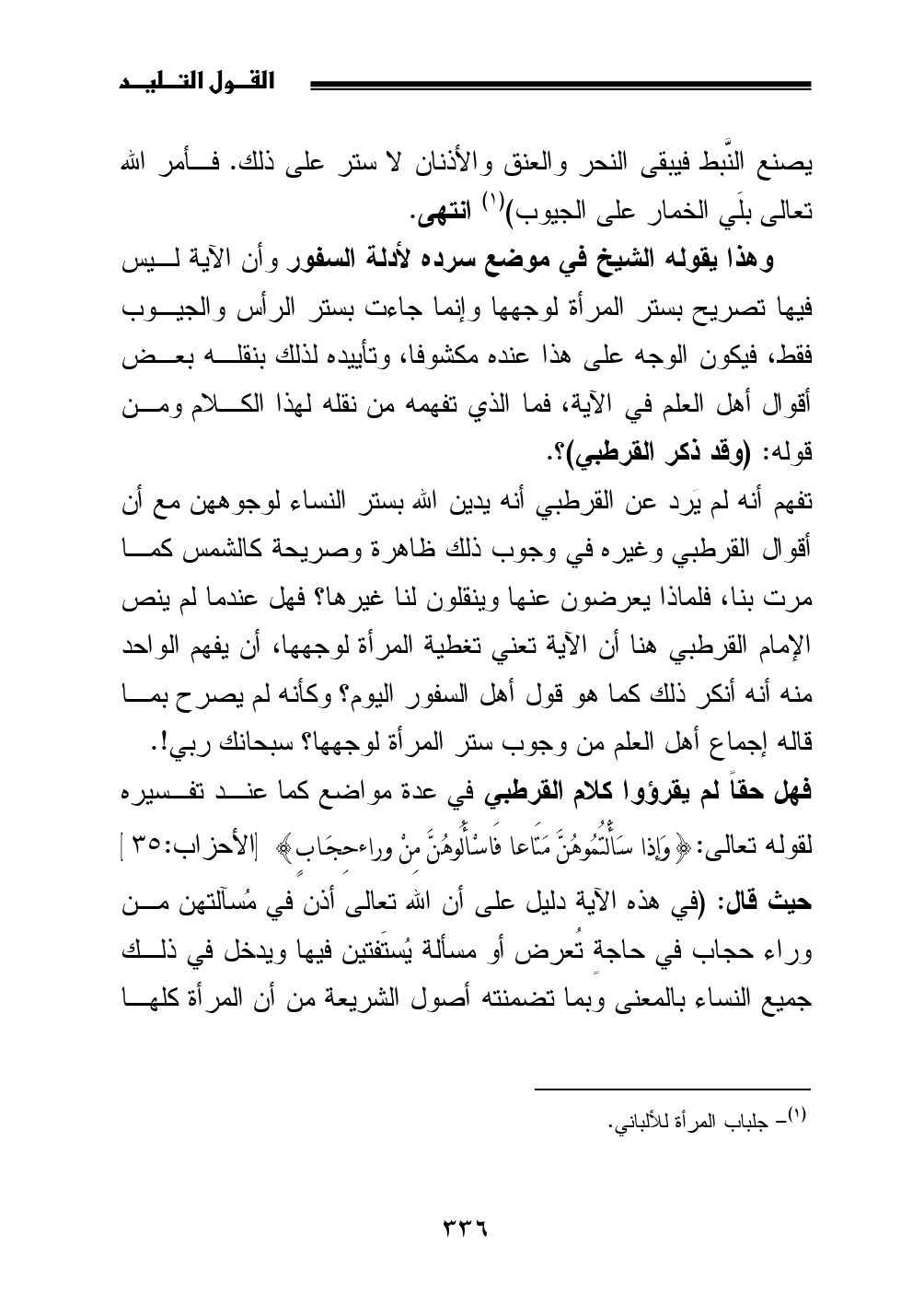 تفهم أنه لم يَرد عن القرطبي أنه يدين الله بستر النساء لوجوههن مع أن أقوال القرطبي وغيره في وجوب ذلك ظاهرة وصريحة كالشمس كما مرت بنا، فلماذا يعرضون عنها وينقلون لنا غيرها؟ فهل عندما لم ينص الإمام القرطبي هنا أن الآية تعني تغطية المرأة لوجهها، أن يفهم الواحد منه أنه أنكر ذلك كما هو قول أهل السفور اليوم؟ وكأنه لم يصرح بما قاله إجماع أهل العلم من وجوب ستر المرأة لوجهها؟ سبحانك ربي! .