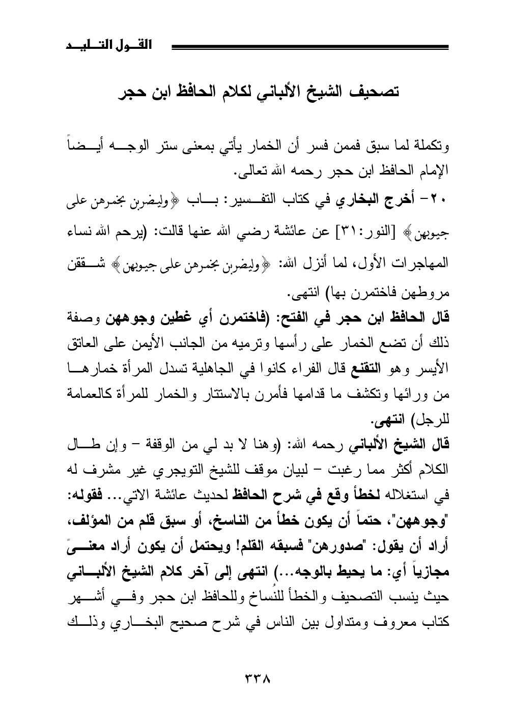 قال الشيخ الألباني رحمه الله: (وهنا لا بد لي من الوقفة - وإن طال الكلام أكثر مما رغبت - لبيان موقف للشيخ التويجري غير مشرف له في استغلاله لخطأ وقع في شرح الحافظ لحديث عائشة الاتي ... فقوله: "وجوههن"، حتماً أن يكون خطأ من الناسخ، أو سبق قلم من المؤلف، أراد أن يقول: "صدورهن" فسبقه القلم! ويحتمل أن يكون أراد معنىً مجازياً أي: ما يحيط بالوجه ... ) انتهى إلى آخر كلام الشيخ الألباني حيث ينسب التصحيف والخطأ للنُساخ وللحافظ ابن حجر وفي أشهر كتاب معروف ومتداول بين الناس في شرح صحيح البخاري وذلك