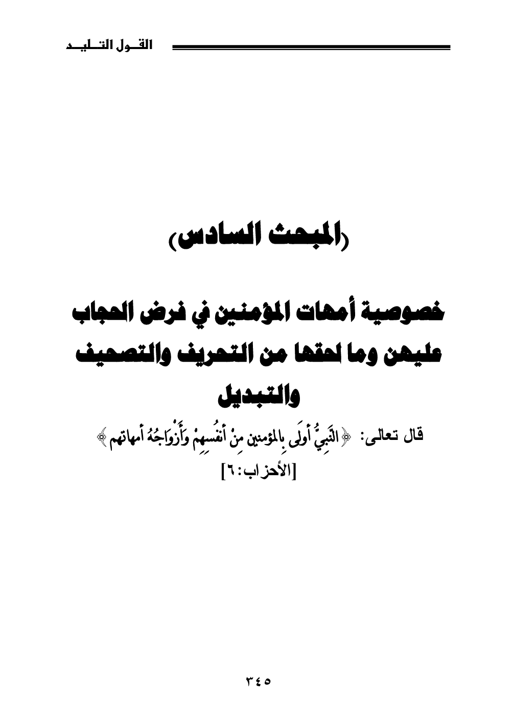 خصوصية أمهات المؤمنين في فرض الحجاب عليهن وما لحقها من التحريف والتصحيف والتبديل قال تعالى: {النَّبِيُّ أولَى بِالمؤمنين مِنْ أنفُسِهِمْ وَأَزْوَاجُهُ أمهاتهم} [الأحزاب: 6]