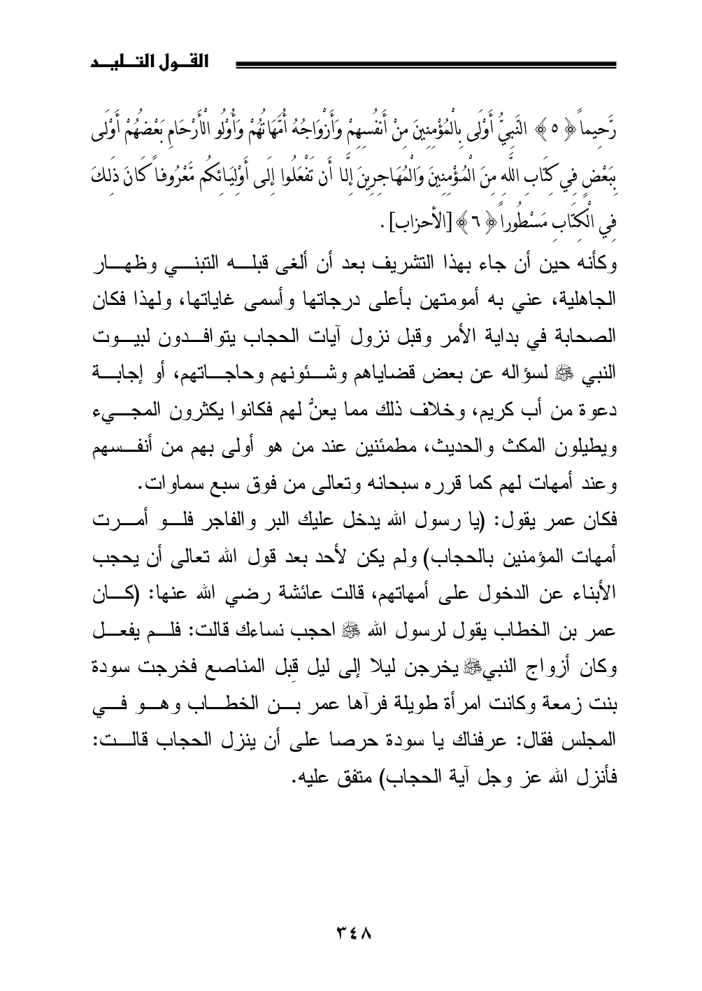 وكأنه حين أن جاء بهذا التشريف بعد أن ألغى قبله التبني وظهار الجاهلية، عني به أمومتهن بأعلى درجاتها وأسمى غاياتها، ولهذا فكان الصحابة في بداية الأمر وقبل نزول آيات الحجاب يتوافدون لبيوت النبي - صلى الله عليه وسلم - لسؤاله عن بعض قضاياهم وشئونهم وحاجاتهم، أو إجابة دعوة من أب كريم، وخلاف ذلك مما يعنُّ لهم فكانوا يكثرون المجيء ويطيلون المكث والحديث، مطمئنين عند من هو أولى بهم من أنفسهم وعند أمهات لهم كما قرره سبحانه وتعالى من فوق سبع سماوات.