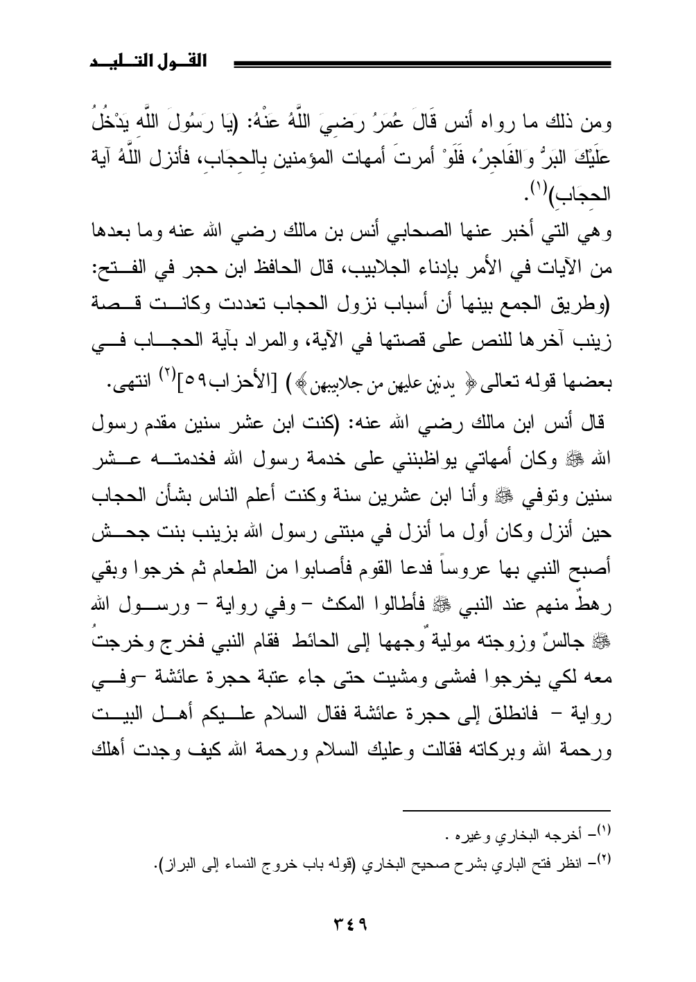 قال أنس ابن مالك رضي الله عنه: (كنت ابن عشر سنين مقدم رسول الله - صلى الله عليه وسلم - وكان أمهاتي يواظبنني على خدمة رسول الله فخدمته عشر سنين وتوفي - صلى الله عليه وسلم - وأنا ابن عشرين سنة وكنت أعلم الناس بشأن الحجاب حين أنزل وكان أول ما أنزل في مبتنى رسول الله بزينب بنت جحش أصبح النبي بها عروساً فدعا القوم فأصابوا من الطعام ثم خرجوا وبقي رهطٌ منهم عند النبي - صلى الله عليه وسلم - فأطالوا المكث - وفي رواية - ورسول الله - صلى الله عليه وسلم - جالسٌ وزوجته موليةٌ وجهها إلى الحائط فقام النبي فخرج وخرجتُ معه لكي يخرجوا فمشى ومشيت حتى جاء عتبة حجرة عائشة -وفي رواية - فانطلق إلى حجرة عائشة فقال السلام عليكم أهل البيت ورحمة الله وبركاته فقالت وعليك السلام ورحمة الله كيف وجدت أهلك