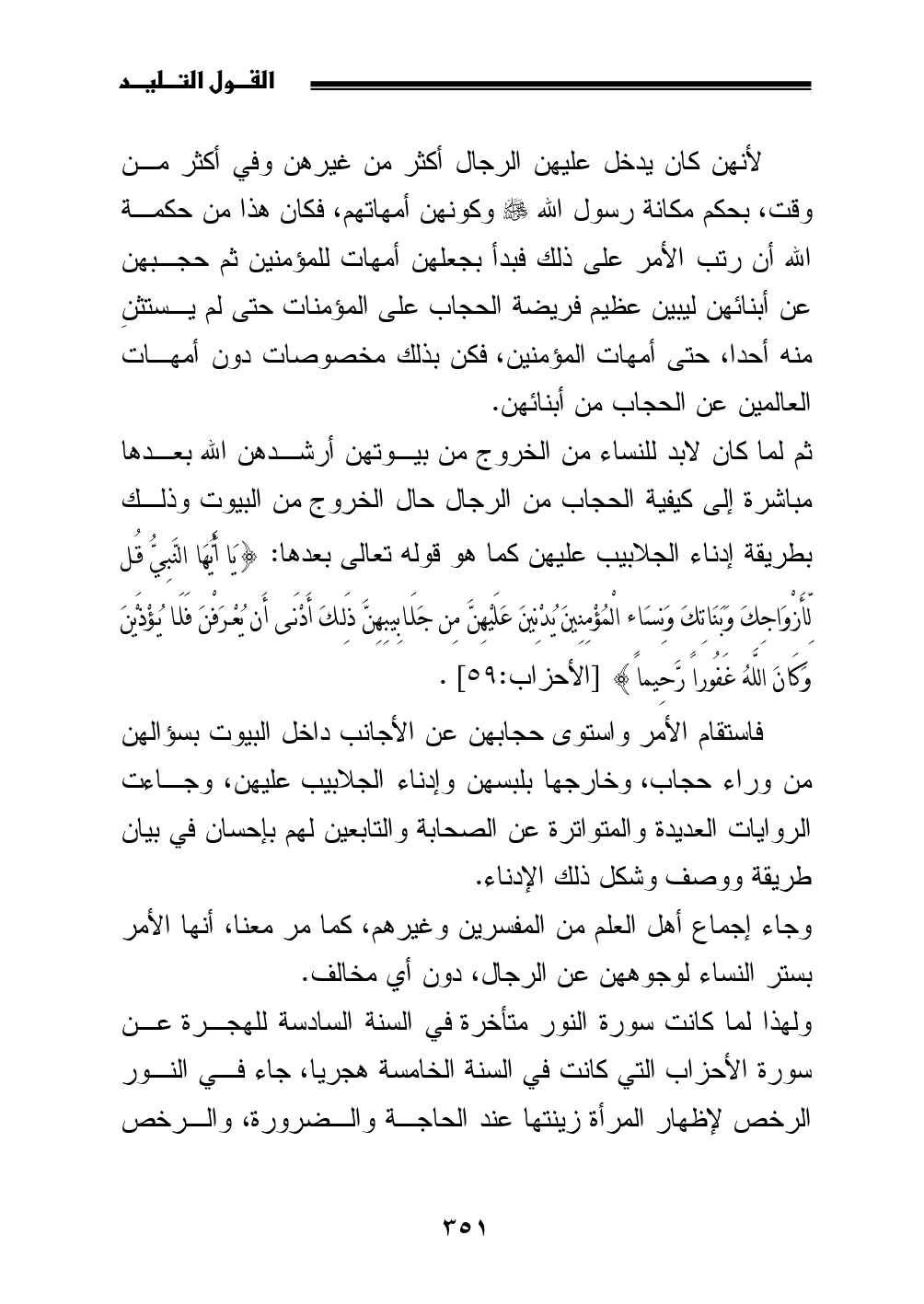 ولهذا لما كانت سورة النور متأخرة في السنة السادسة للهجرة عن سورة الأحزاب التي كانت في السنة الخامسة هجريا، جاء في النور الرخص لإظهار المرأة زينتها عند الحاجة والضرورة، والرخص