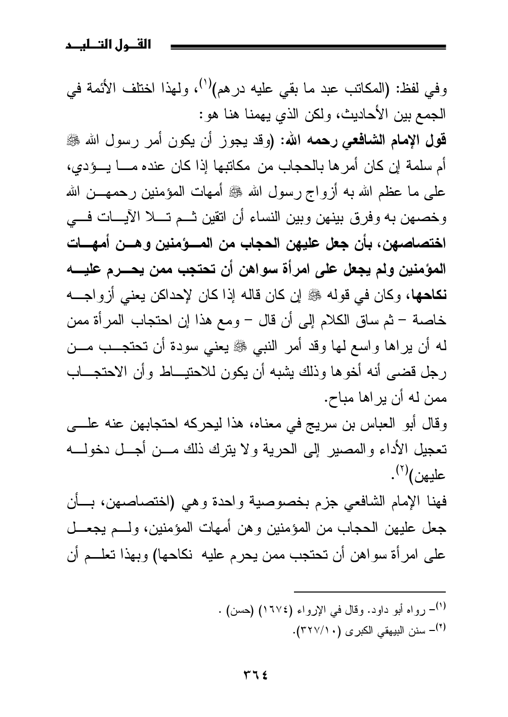 قول الإمام الشافعي رحمه الله: (وقد يجوز أن يكون أمر رسول الله - صلى الله عليه وسلم - أم سلمة إن كان أمرها بالحجاب من مكاتبها إذا كان عنده ما يؤدي، على ما عظم الله به أزواج رسول الله - صلى الله عليه وسلم - أمهات المؤمنين رحمهن الله وخصهن به وفرق بينهن وبين النساء أن اتقين ثم تلا الآيات في اختصاصهن، بأن جعل عليهن الحجاب من المؤمنين وهن أمهات المؤمنين ولم يجعل على امرأة سواهن أن تحتجب ممن يحرم عليه نكاحها، وكان في قوله - صلى الله عليه وسلم - إن كان قاله إذا كان لإحداكن يعني أزواجه خاصة - ثم ساق الكلام إلى أن قال - ومع هذا إن احتجاب المرأة ممن له أن يراها واسع لها وقد أمر النبي - صلى الله عليه وسلم - يعني سودة أن تحتجب من رجل قضى أنه أخوها وذلك يشبه أن يكون للاحتياط وأن الاحتجاب ممن له أن يراها مباح.