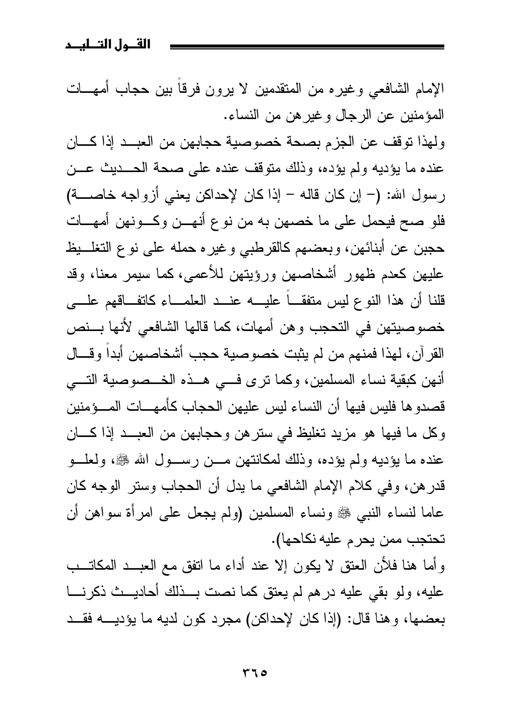 ولهذا توقف عن الجزم بصحة خصوصية حجابهن من العبد إذا كان عنده ما يؤديه ولم يؤده، وذلك متوقف عنده على صحة الحديث عن رسول الله: (- إن كان قاله - إذا كان لإحداكن يعني أزواجه خاصة) فلو صح فيحمل على ما خصهن به من نوع أنهن وكونهن أمهات حجبن عن أبنائهن، وبعضهم كالقرطبي وغيره حمله على نوع التغليظ عليهن كعدم ظهور أشخاصهن ورؤيتهن للأعمى، كما سيمر معنا، وقد قلنا أن هذا النوع ليس متفقاً عليه عند العلماء كاتفاقهم على خصوصيتهن في التحجب وهن أمهات، كما قالها الشافعي لأنها بنص القرآن، لهذا فمنهم من لم يثبت خصوصية حجب أشخاصهن أبداً وقال أنهن كبقية نساء المسلمين، وكما ترى في هذه الخصوصية التي قصدوها فليس فيها أن النساء ليس عليهن الحجاب كأمهات المؤمنين وكل ما فيها هو مزيد تغليظ في سترهن وحجابهن من العبد إذا كان عنده ما يؤديه ولم يؤده، وذلك لمكانتهن من رسول الله - صلى الله عليه وسلم -، ولعلو قدرهن، وفي كلام الإمام الشافعي ما يدل أن الحجاب وستر الوجه كان عاما لنساء النبي - صلى الله عليه وسلم - ونساء المسلمين (ولم يجعل على امرأة سواهن أن تحتجب ممن يحرم عليه نكاحها).