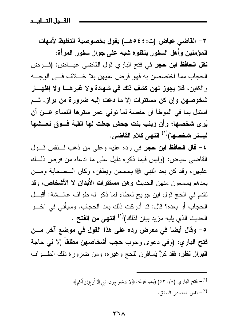 4 - قال الحافظ ابن حجر في رده عليه وعلى من ذهب لنفس قول القاضي عياض: (وليس فيما ذكره دليل على ما ادعاه من فرض ذلك عليهن، وقد كن بعد النبي - صلى الله عليه وسلم - يحججن ويطفن، وكان الصحابة ومن بعدهم يسمعون منهن الحديث وهن مستترات الأبدان لا الأشخاص، وقد تقدم في الحج قول ابن جريج لعطاء لما ذكر له طواف عائشة: أقَبل الحجاب أو بعده؟ قال: قد أدركت ذلك بعد الحجاب. وسيأتي في آخر الحديث الذي يليه مزيد بيان لذلك) (¬2) انتهى من الفتح.