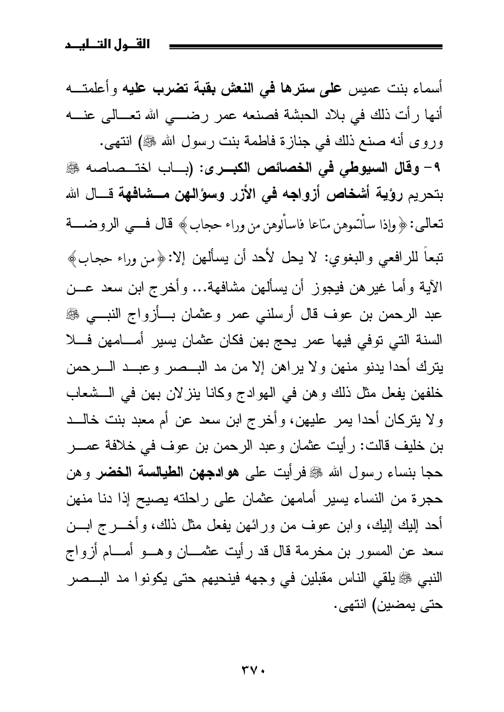 9 - وقال السيوطي في الخصائص الكبرى: (باب اختصاصه - صلى الله عليه وسلم - بتحريم رؤية أشخاص أزواجه في الأزر وسؤالهن مشافهة قال الله تعالى: {وإذا سألتموهن متاعا فاسألوهن من وراء حجاب} قال في الروضة تبعاً للرافعي والبغوي: لا يحل لأحد أن يسألهن إلا: {من وراء حجاب} الآية وأما غيرهن فيجوز أن يسألهن مشافهة ... وأخرج ابن سعد عن عبد الرحمن بن عوف قال أرسلني عمر وعثمان بأزواج النبي - صلى الله عليه وسلم - السنة التي توفي فيها عمر يحج بهن فكان عثمان يسير أمامهن فلا يترك أحدا يدنو منهن ولا يراهن إلا من مد البصر وعبد الرحمن خلفهن يفعل مثل ذلك وهن في الهوادج وكانا ينزلان بهن في الشعاب ولا يتركان أحدا يمر عليهن، وأخرج ابن سعد عن أم معبد بنت خالد بن خليف قالت: رأيت عثمان وعبد الرحمن بن عوف في خلافة عمر حجا بنساء رسول الله - صلى الله عليه وسلم - فرأيت على هوادجهن الطيالسة الخضر وهن حجرة من النساء يسير أمامهن عثمان على راحلته يصيح إذا دنا منهن أحد إليك إليك، وابن عوف من ورائهن يفعل مثل ذلك، وأخرج ابن سعد عن المسور بن مخرمة قال قد رأيت عثمان وهو أمام أزواج النبي - صلى الله عليه وسلم - يلقي الناس مقبلين في وجهه فينحيهم حتى يكونوا مد البصر حتى يمضين) انتهى.