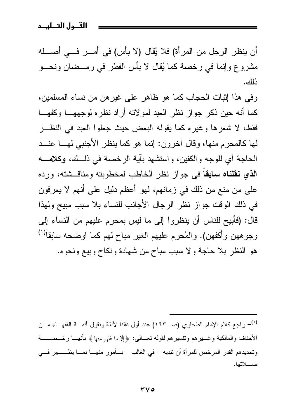 (¬1) راجع كلام الإمام الطحاوي (صـ 163) عند أول نقلنا لأدلة ونقول أئمة الفقهاء من الأحناف والمالكية وغيرهم وتفسيرهم لقوله تعالى: {إلا ما ظهر منها} بأنها رخصة وتحديدهم القدر المرخص للمرأة أن تبديه - في الغالب - بأمور منها بما يظهر في صلاتها.