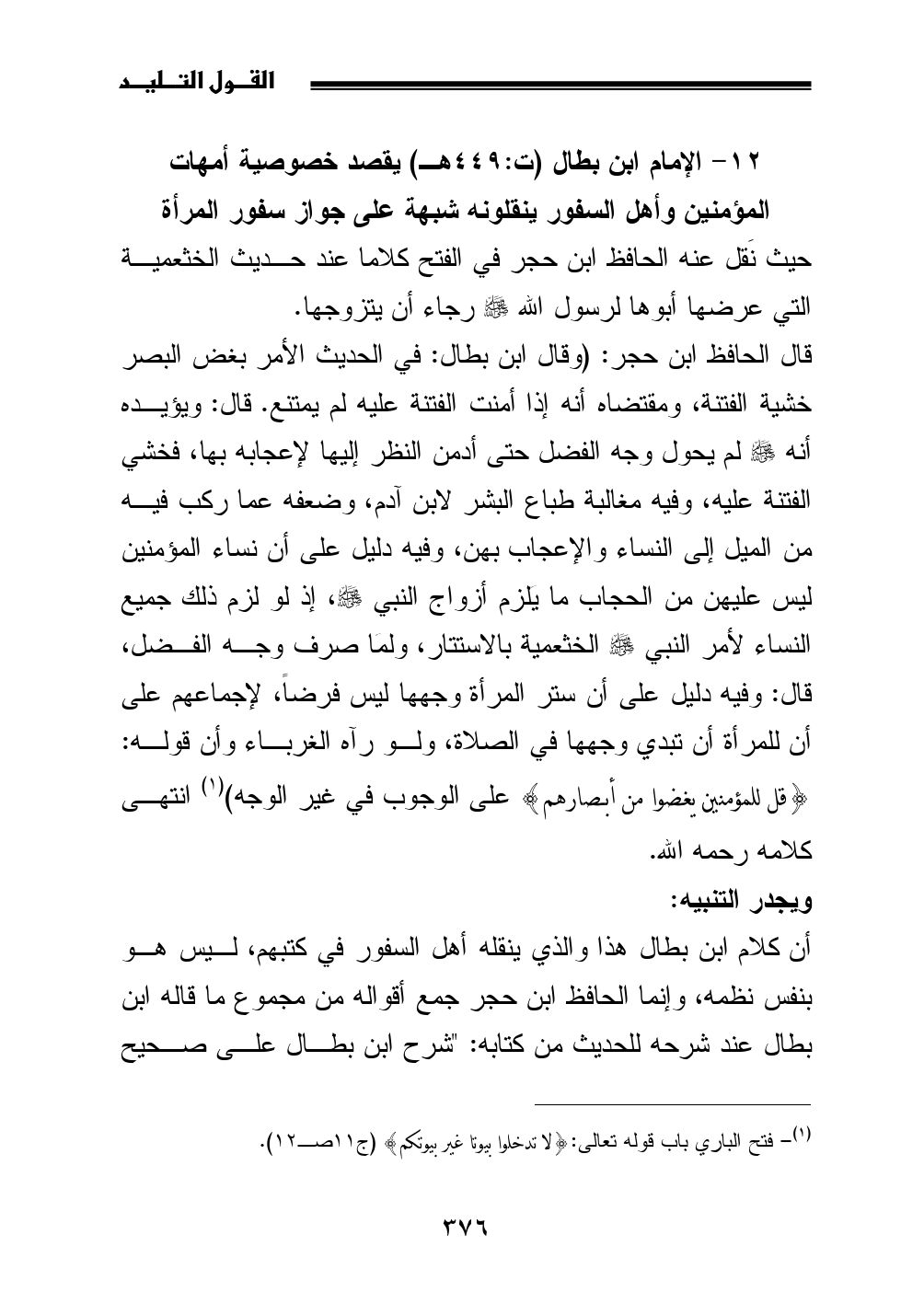12 - الإمام ابن بطال (ت: 449 هـ) يقصد خصوصية أمهات المؤمنين وأهل السفور ينقلونه شبهة على جواز سفور المرأة