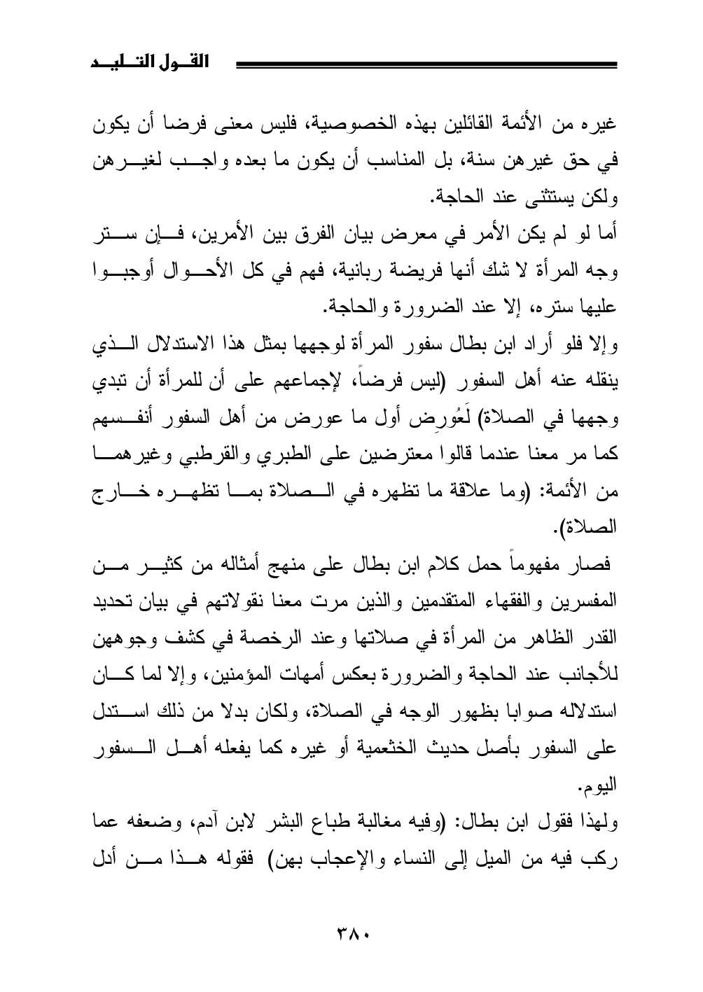 فصار مفهوماً حمل كلام ابن بطال على منهج أمثاله من كثير من المفسرين والفقهاء المتقدمين والذين مرت معنا نقولاتهم في بيان تحديد القدر الظاهر من المرأة في صلاتها وعند الرخصة في كشف وجوههن للأجانب عند الحاجة والضرورة بعكس أمهات المؤمنين، وإلا لما كان استدلاله صوابا بظهور الوجه في الصلاة، ولكان بدلا من ذلك استدل على السفور بأصل حديث الخثعمية أو غيره كما يفعله أهل السفور اليوم.