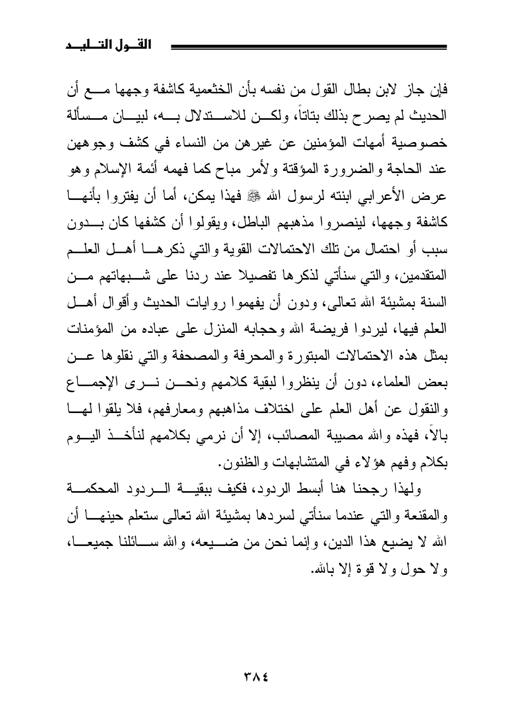 فإن جاز لابن بطال القول من نفسه بأن الخثعمية كاشفة وجهها مع أن الحديث لم يصرح بذلك بتاتاً، ولكن للاستدلال به، لبيان مسألة خصوصية أمهات المؤمنين عن غيرهن من النساء في كشف وجوههن عند الحاجة والضرورة المؤقتة ولأمر مباح كما فهمه أئمة الإسلام وهو عرض الأعرابي ابنته لرسول الله - صلى الله عليه وسلم - فهذا يمكن، أما أن يفتروا بأنها كاشفة وجهها، لينصروا مذهبهم الباطل، ويقولوا أن كشفها كان بدون سبب أو احتمال من تلك الاحتمالات القوية والتي ذكرها أهل العلم المتقدمين، والتي سنأتي لذكرها تفصيلا عند ردنا على شبهاتهم من السنة بمشيئة الله تعالى، ودون أن يفهموا روايات الحديث وأقوال أهل العلم فيها، ليردوا فريضة الله وحجابه المنزل على عباده من المؤمنات بمثل هذه الاحتمالات المبتورة والمحرفة والمصحفة والتي نقلوها عن بعض العلماء، دون أن ينظروا لبقية كلامهم ونحن نرى الإجماع والنقول عن أهل العلم على اختلاف مذاهبهم ومعارفهم، فلا يلقوا لها بالاً، فهذه والله مصيبة المصائب، إلا أن نرمي بكلامهم لنأخذ اليوم بكلام وفهم هؤلاء في المتشابهات والظنون.