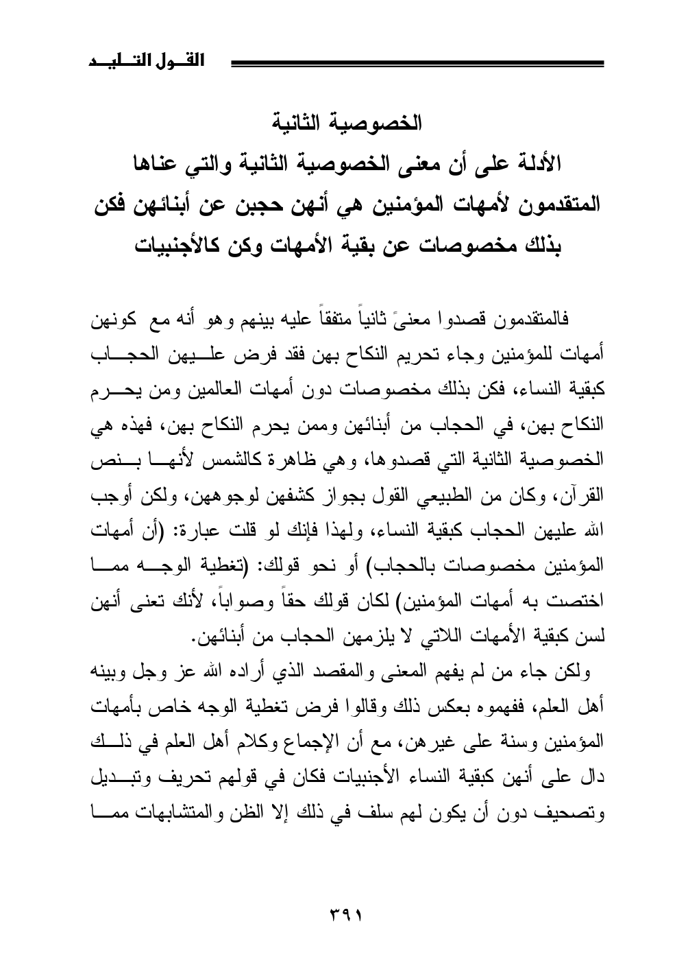 فالمتقدمون قصدوا معنىً ثانياً متفقاً عليه بينهم وهو أنه مع كونهن أمهات للمؤمنين وجاء تحريم النكاح بهن فقد فرض عليهن الحجاب كبقية النساء، فكن بذلك مخصوصات دون أمهات العالمين ومن يحرم النكاح بهن، في الحجاب من أبنائهن وممن يحرم النكاح بهن، فهذه هي الخصوصية الثانية التي قصدوها، وهي ظاهرة كالشمس لأنها بنص القرآن، وكان من الطبيعي القول بجواز كشفهن لوجوههن، ولكن أوجب الله عليهن الحجاب كبقية النساء، ولهذا فإنك لو قلت عبارة: (أن أمهات المؤمنين مخصوصات بالحجاب) أو نحو قولك: (تغطية الوجه مما اختصت به أمهات المؤمنين) لكان قولك حقاً وصواباً، لأنك تعنى أنهن لسن كبقية الأمهات اللاتي لا يلزمهن الحجاب من أبنائهن.