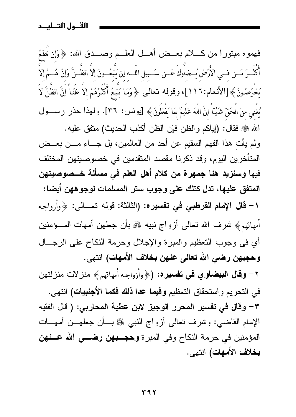 3 - وقال في تفسير المحرر الوجيز لابن عطية المحاربي: (قال الفقيه الإمام القاضي: وشرف تعالى أزواج النبي - صلى الله عليه وسلم - بأن جعلهن أمهات المؤمنين في حرمة النكاح وفي المبرة وحجبهن رضي الله عنهن بخلاف الأمهات) انتهى.