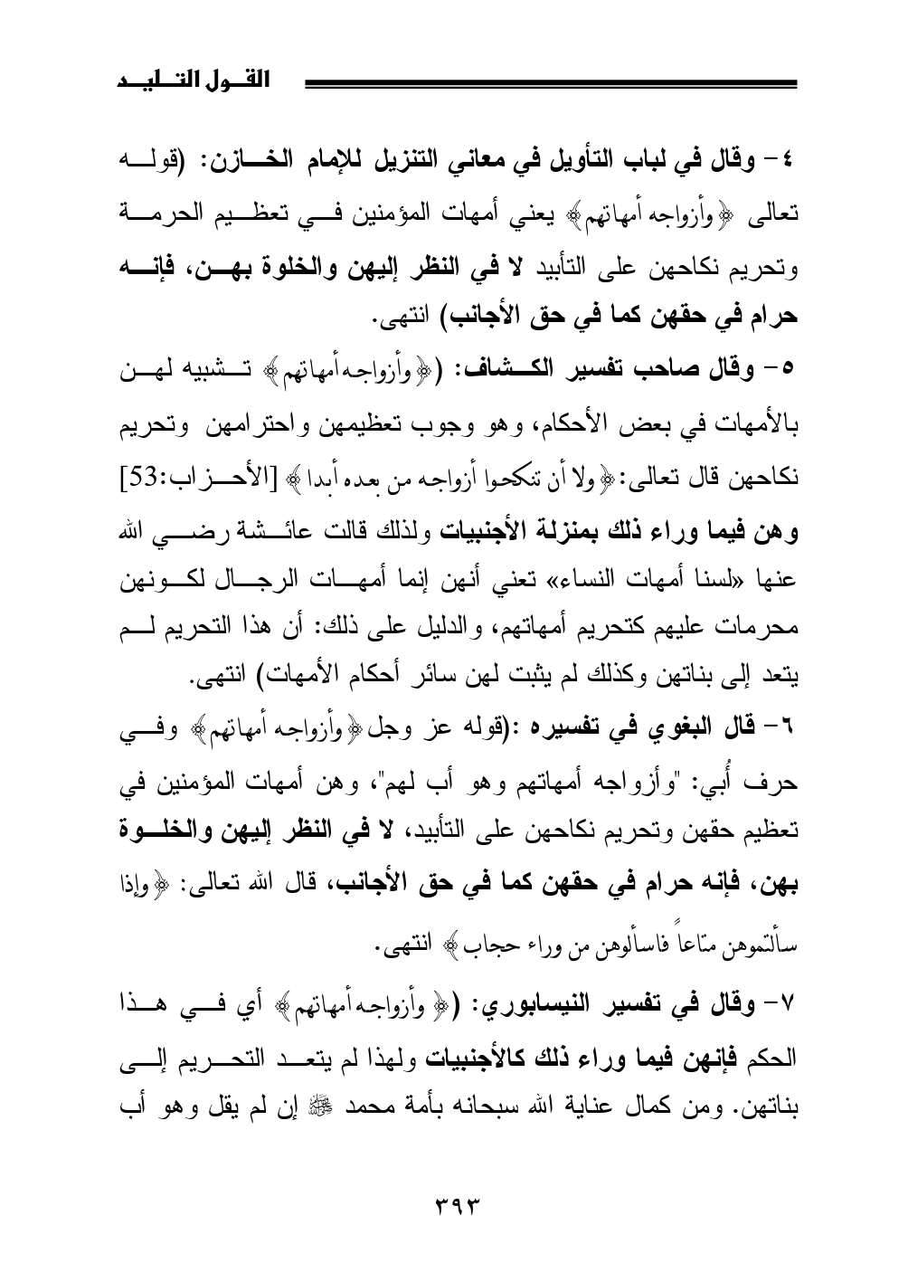 4 - وقال في لباب التأويل في معاني التنزيل للإمام الخازن: (قوله تعالى {وأزواجه أمهاتهم} يعني أمهات المؤمنين في تعظيم الحرمة وتحريم نكاحهن على التأبيد لا في النظر إليهن والخلوة بهن، فإنه حرام في حقهن كما في حق الأجانب) انتهى.