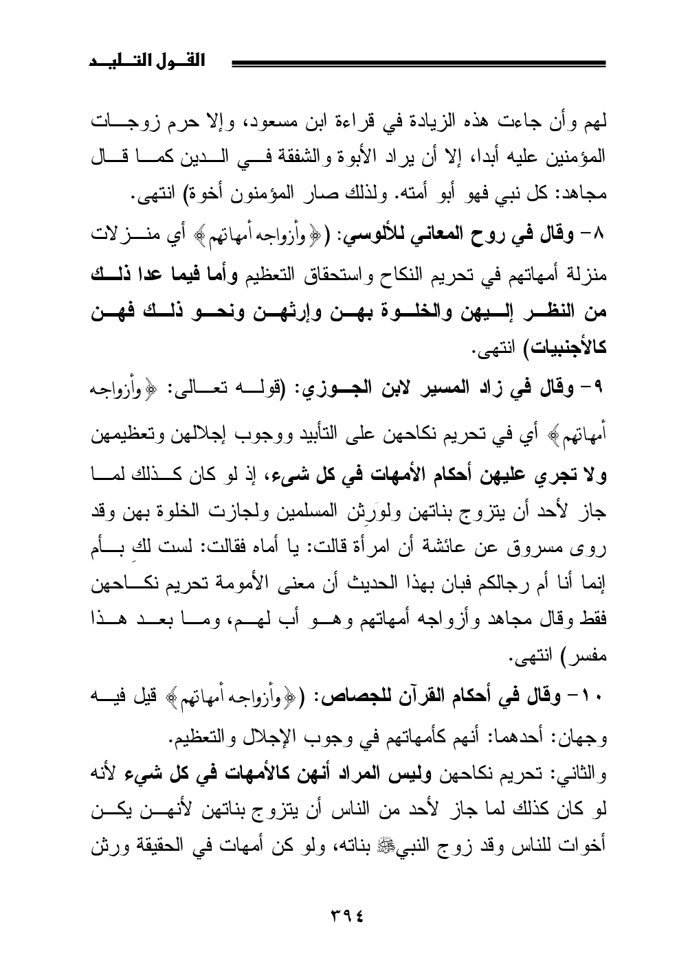 8 - وقال في روح المعاني للألوسي: ({وأزواجه أمهاتهم} أي منزلات منزلة أمهاتهم في تحريم النكاح واستحقاق التعظيم وأما فيما عدا ذلك من النظر إليهن والخلوة بهن وإرثهن ونحو ذلك فهن كالأجنبيات) انتهى.