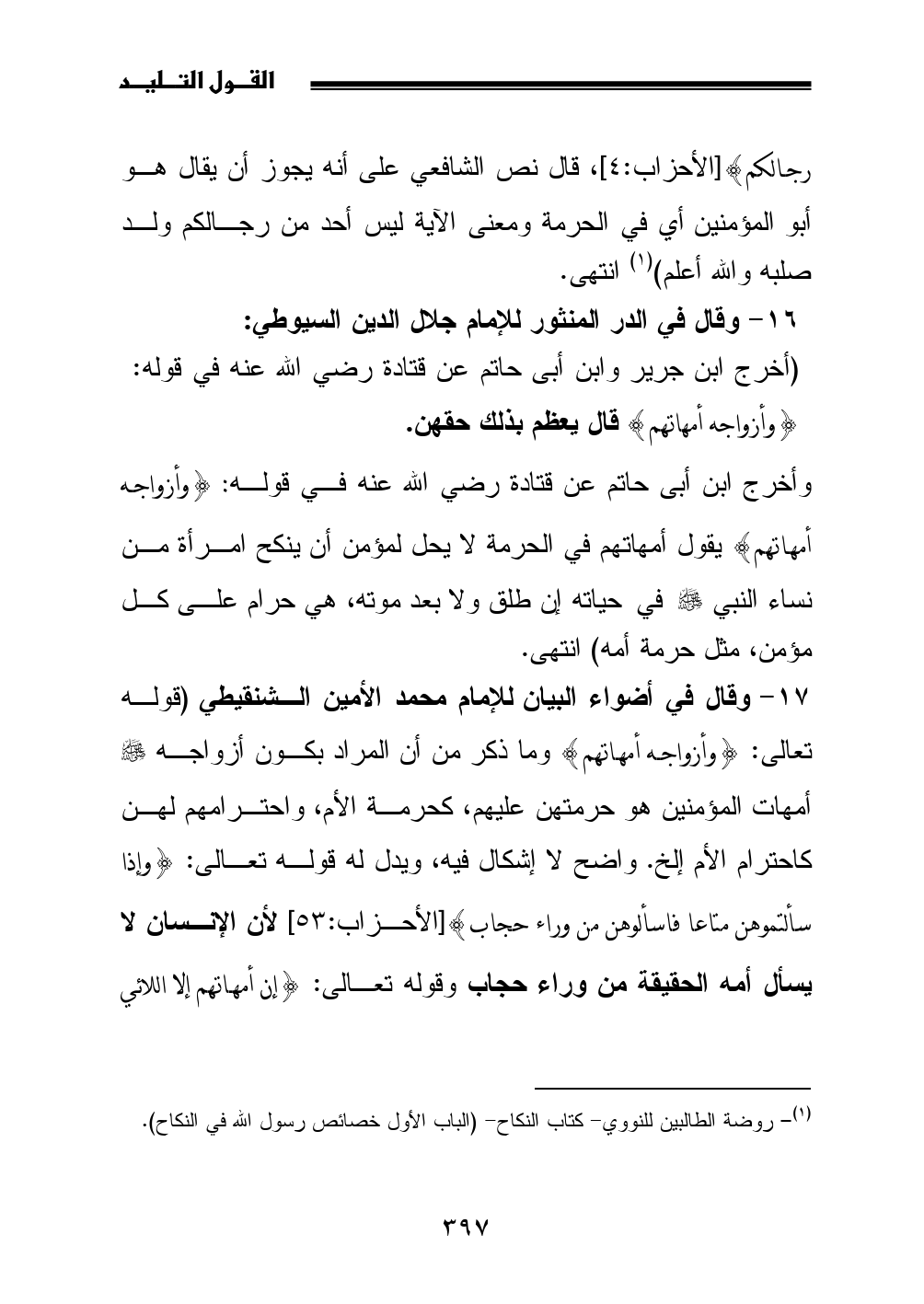 17 - وقال في أضواء البيان للإمام محمد الأمين الشنقيطي (قوله تعالى: {وأزواجه أمهاتهم} وما ذكر من أن المراد بكون أزواجه - صلى الله عليه وسلم - أمهات المؤمنين هو حرمتهن عليهم، كحرمة الأم، واحترامهم لهن كاحترام الأم إلخ. واضح لا إشكال فيه، ويدل له قوله تعالى: {وإذا سألتموهن متاعا فاسألوهن من وراء حجاب} [الأحزاب: 53] لأن الإنسان لا يسأل أمه الحقيقة من وراء حجاب وقوله تعالى: {إن أمهاتهم إلا اللائي