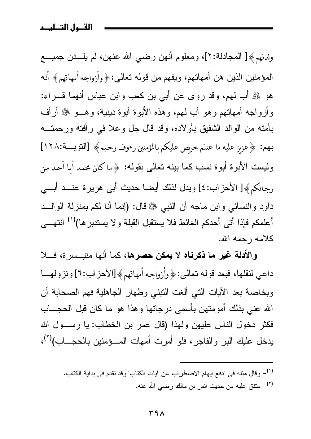 والأدلة غير ما ذكرناه لا يمكن حصرها، كما أنها متيسرة، فلا داعي لنقلها، فبعد قوله تعالى: {وأزواجه أمهاتهم} [الأحزاب: 6] ونزولها وبخاصة بعد الآيات التي ألغت التبني وظهار الجاهلية فهم الصحابة أن الله عني بذلك أمومتهن بأسمى درجاتها وهذا هو ما كان قبل الحجاب فكثر دخول الناس عليهن ولهذا (قال عمر بن الخطاب: يا رسول الله يدخل عليك البر والفاجر، فلو أمرت أمهات المؤمنين بالحجاب) (¬2)،