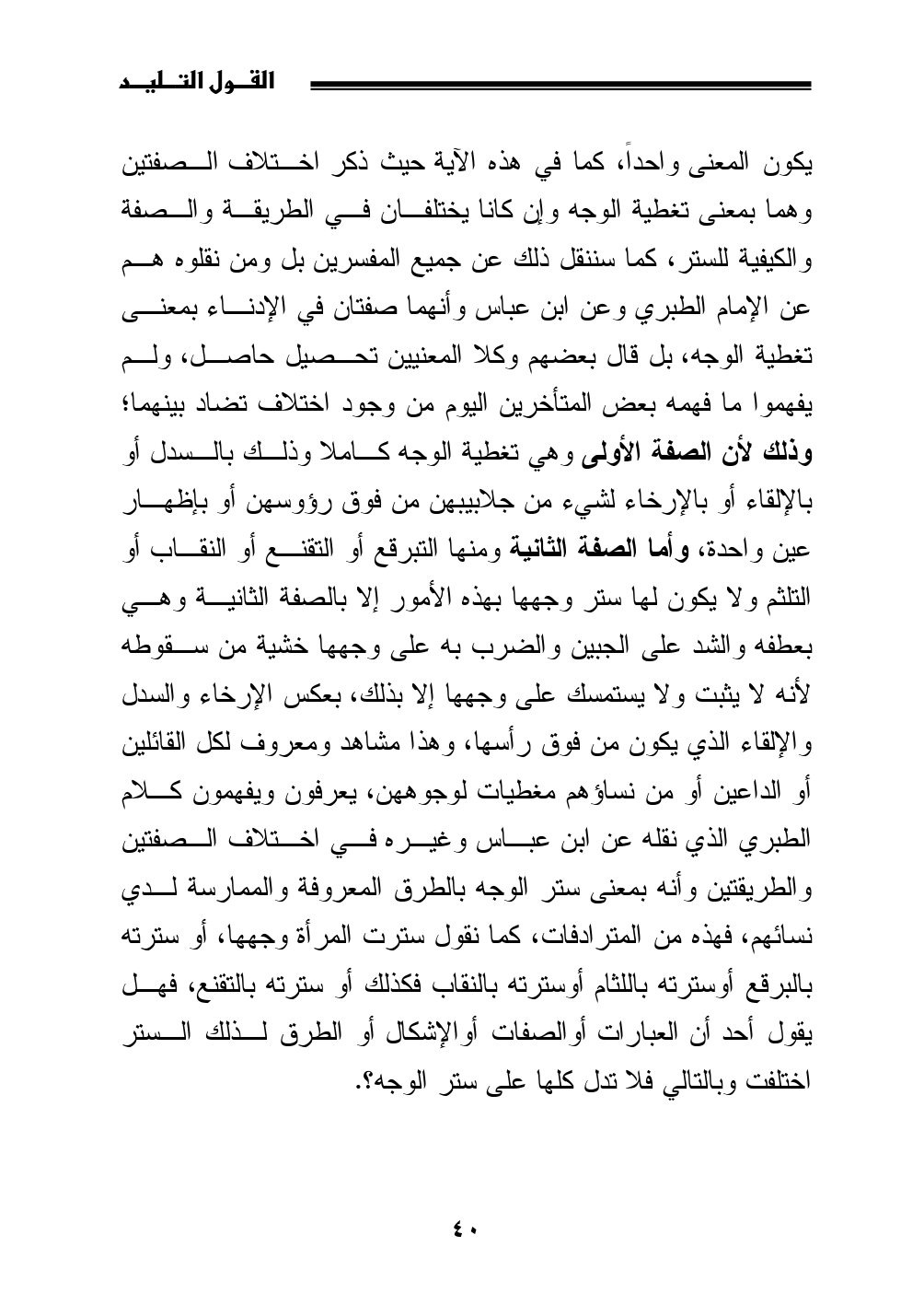 يكون المعنى واحداً، كما في هذه الآية حيث ذكر اختلاف الصفتين وهما بمعنى تغطية الوجه وإن كانا يختلفان في الطريقة والصفة والكيفية للستر، كما سننقل ذلك عن جميع المفسرين بل ومن نقلوه هم عن الإمام الطبري وعن ابن عباس وأنهما صفتان في الإدناء بمعنى تغطية الوجه، بل قال بعضهم وكلا المعنيين تحصيل حاصل، ولم يفهموا ما فهمه بعض المتأخرين اليوم من وجود اختلاف تضاد بينهما؛ وذلك لأن الصفة الأولى وهي تغطية الوجه كاملا وذلك بالسدل أو بالإلقاء أو بالإرخاء لشيء من جلابيبهن من فوق رؤوسهن أو بإظهار عين واحدة، وأما الصفة الثانية ومنها التبرقع أو التقنع أو النقاب أو التلثم ولا يكون لها ستر وجهها بهذه الأمور إلا بالصفة الثانية وهي بعطفه والشد على الجبين والضرب به على وجهها خشية من سقوطه لأنه لا يثبت ولا يستمسك على وجهها إلا بذلك، بعكس الإرخاء والسدل والإلقاء الذي يكون من فوق رأسها، وهذا مشاهد ومعروف لكل القائلين أو الداعين أو من نساؤهم مغطيات لوجوههن، يعرفون ويفهمون كلام الطبري الذي نقله عن ابن عباس وغيره في اختلاف الصفتين والطريقتين وأنه بمعنى ستر الوجه بالطرق المعروفة والممارسة لدي نسائهم، فهذه من المترادفات، كما نقول سترت المرأة وجهها، أو سترته بالبرقع أوسترته باللثام أوسترته بالنقاب فكذلك أو سترته بالتقنع، فهل يقول أحد أن العبارات أوالصفات أوالإشكال أو الطرق لذلك الستر اختلفت وبالتالي فلا تدل كلها على ستر الوجه؟ .