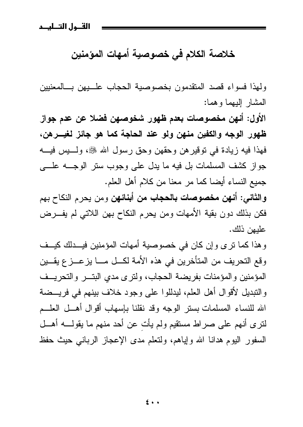 وهذا كما ترى وإن كان في خصوصية أمهات المؤمنين فيدلك كيف وقع التحريف من المتأخرين في هذه الأمة لكل ما يزعزع يقين المؤمنين والمؤمنات بفريضة الحجاب، ولترى مدي البتر والتحريف والتبديل لأقوال أهل العلم، ليدللوا على وجود خلاف بينهم في فريضة الله للنساء المسلمات بستر الوجه وقد نقلنا بإسهاب أقوال أهل العلم لترى أنهم على صراط مستقيم ولم يأتِ عن أحد منهم ما يقوله أهل السفور اليوم هدانا الله وإياهم، ولتعلم مدى الإعجاز الرباني حيث حفظ