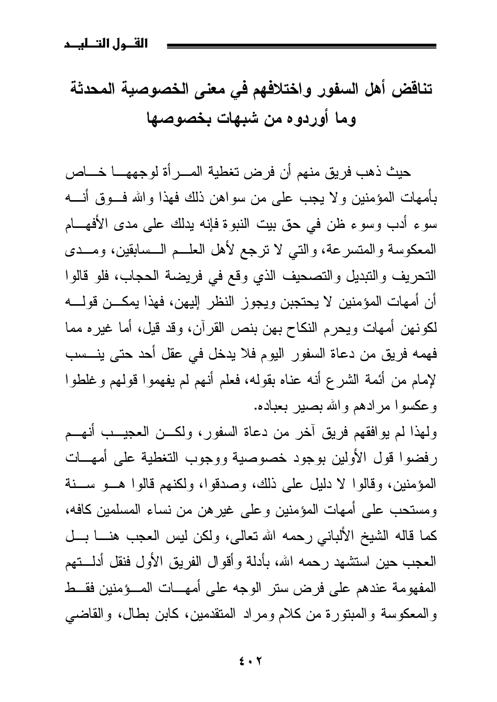 ولهذا لم يوافقهم فريق آخر من دعاة السفور، ولكن العجيب أنهم رفضوا قول الأولين بوجود خصوصية ووجوب التغطية على أمهات المؤمنين، وقالوا لا دليل على ذلك، وصدقوا، ولكنهم قالوا هو سنة ومستحب على أمهات المؤمنين وعلى غيرهن من نساء المسلمين كافه، كما قاله الشيخ الألباني رحمه الله تعالى، ولكن ليس العجب هنا بل العجب حين استشهد رحمه الله، بأدلة وأقوال الفريق الأول فنقل أدلتهم المفهومة عندهم على فرض ستر الوجه على أمهات المؤمنين فقط والمعكوسة والمبتورة من كلام ومراد المتقدمين، كابن بطال، والقاضي