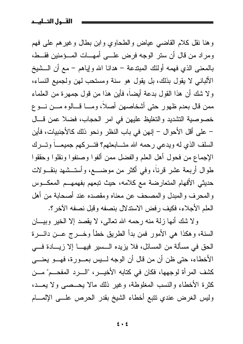 وهنا نقل كلام القاضي عياض والطحاوي وابن بطال وغيرهم على فهم ومراد من قال أن ستر الوجه فرض على أمهات المؤمنين فقط، بالمعنى الذي فهمه أولئك المبتدعة - هدانا الله وإياهم - مع أن الشيخ الألباني لا يقول بذلك، بل يقول هو سنة ومستحب لهن ولجميع النساء، ولا شك أن هذا القول بدعة أيضاً، فأين هذا من قول جمهرة من العلماء ممن قال بعدم ظهور حتى أشخاصهن أصلاً، وما قالوه من نوع خصوصية التشديد والتغليظ عليهن في امر الحجاب، فضلا عمن قال - على أقل الأحوال - إنهن في باب النظر ونحو ذلك كالأجنبيات، فأين السلف الذي له ويدعي رحمه الله متابعتهم؟ فتركهم جميعاً وترك الإجماع من فحول أهل العلم والفضل ممن ألفوا وصنفوا ونقلوا وحققوا طوال أربعة عشر قرناً، وفي أكثر من موضع، وأستشهد بنقولات حديثي الأفهام المتعارضة مع كلامه، حيث تبعهم بفهمهم المعكوس والمحرف والمبدل والمصحف عن معناه ومقصده عند أصحابة من أهل العلم الأجلاء، فكيف رفض الاستدلال بنصفه وقبل نصفه الآخر؟ .