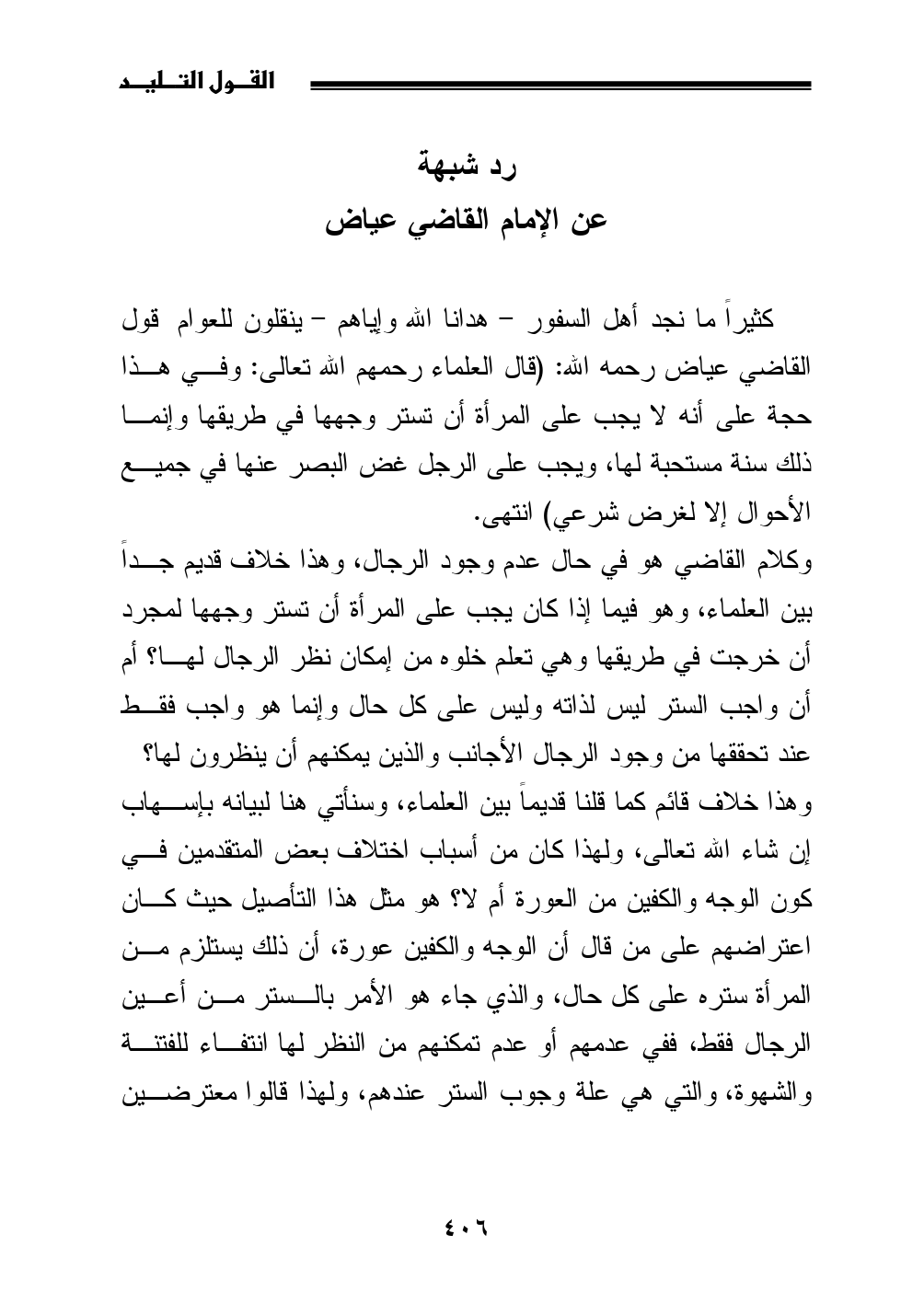 كثيراً ما نجد أهل السفور - هدانا الله وإياهم - ينقلون للعوام قول القاضي عياض رحمه الله: (قال العلماء رحمهم الله تعالى: وفي هذا حجة على أنه لا يجب على المرأة أن تستر وجهها في طريقها وإنما ذلك سنة مستحبة لها، ويجب على الرجل غض البصر عنها في جميع الأحوال إلا لغرض شرعي) انتهى.