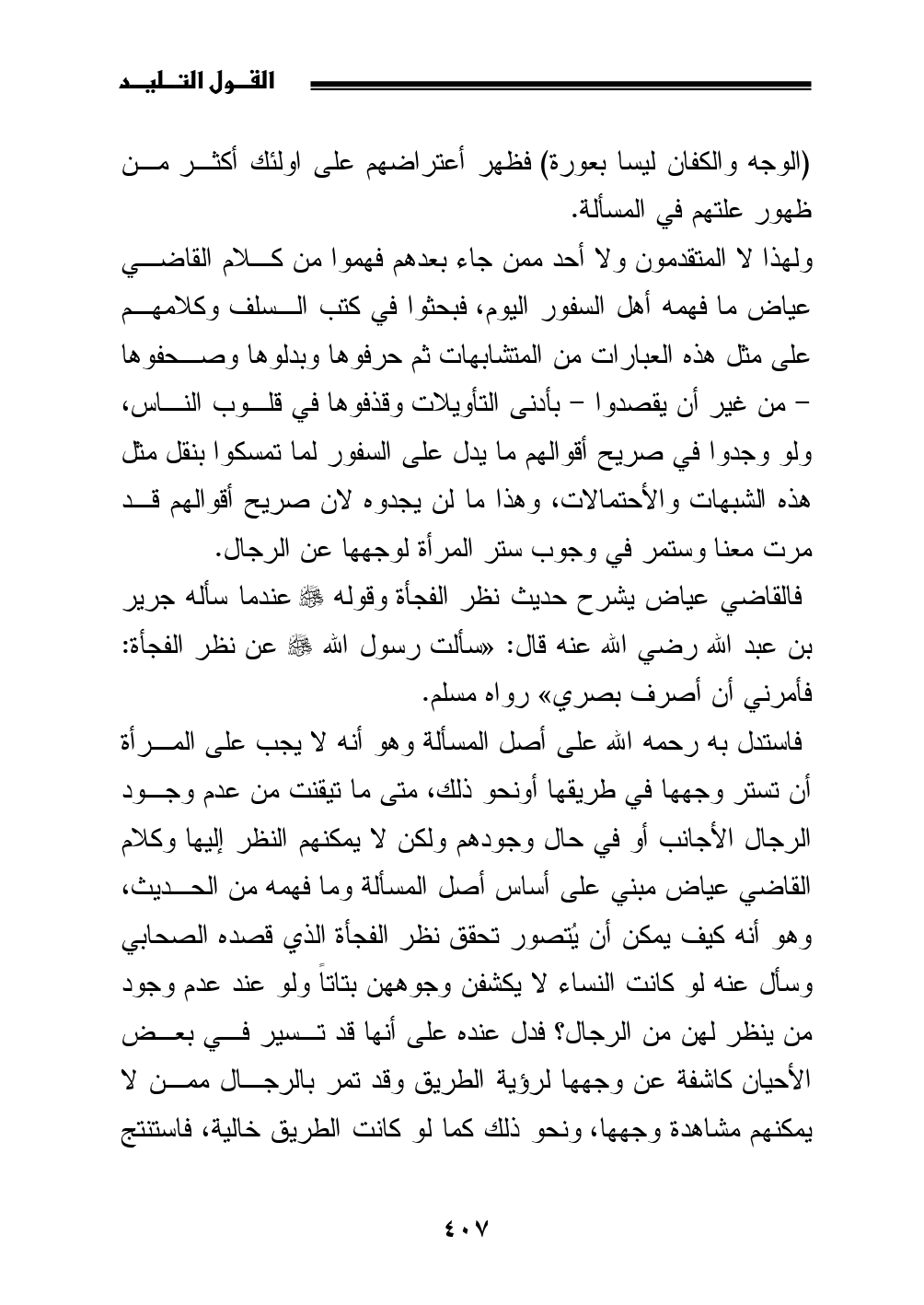 (الوجه والكفان ليسا بعورة) فظهر أعتراضهم على اولئك أكثر من ظهور علتهم في المسألة.