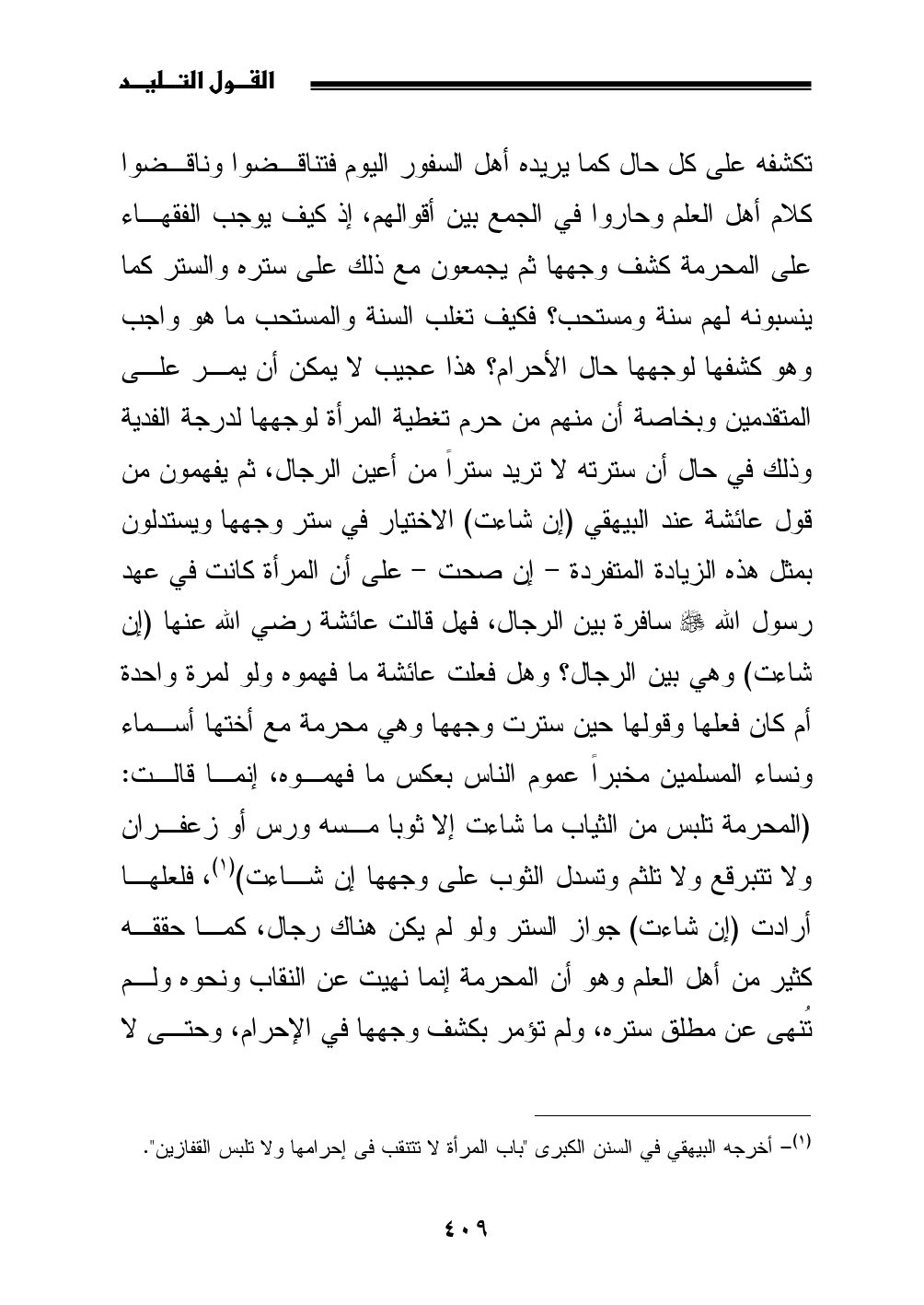 تكشفه على كل حال كما يريده أهل السفور اليوم فتناقضوا وناقضوا كلام أهل العلم وحاروا في الجمع بين أقوالهم، إذ كيف يوجب الفقهاء على المحرمة كشف وجهها ثم يجمعون مع ذلك على ستره والستر كما ينسبونه لهم سنة ومستحب؟ فكيف تغلب السنة والمستحب ما هو واجب وهو كشفها لوجهها حال الأحرام؟ هذا عجيب لا يمكن أن يمر على المتقدمين وبخاصة أن منهم من حرم تغطية المرأة لوجهها لدرجة الفدية وذلك في حال أن سترته لا تريد ستراً من أعين الرجال، ثم يفهمون من قول عائشة عند البيهقي (إن شاءت) الاختيار في ستر وجهها ويستدلون بمثل هذه الزيادة المتفردة - إن صحت - على أن المرأة كانت في عهد رسول الله - صلى الله عليه وسلم - سافرة بين الرجال، فهل قالت عائشة رضي الله عنها (إن شاءت) وهي بين الرجال؟ وهل فعلت عائشة ما فهموه ولو لمرة واحدة أم كان فعلها وقولها حين سترت وجهها وهي محرمة مع أختها أسماء ونساء المسلمين مخبراً عموم الناس بعكس ما فهموه، إنما قالت: (المحرمة تلبس من الثياب ما شاءت إلا ثوبا مسه ورس أو زعفران ولا تتبرقع ولا تلثم وتسدل الثوب على وجهها إن شاءت) (¬1)، فلعلها أرادت (إن شاءت) جواز الستر ولو لم يكن هناك رجال، كما حققه كثير من أهل العلم وهو أن المحرمة إنما نهيت عن النقاب ونحوه ولم تُنهى عن مطلق ستره، ولم تؤمر بكشف وجهها في الإحرام، وحتى لا