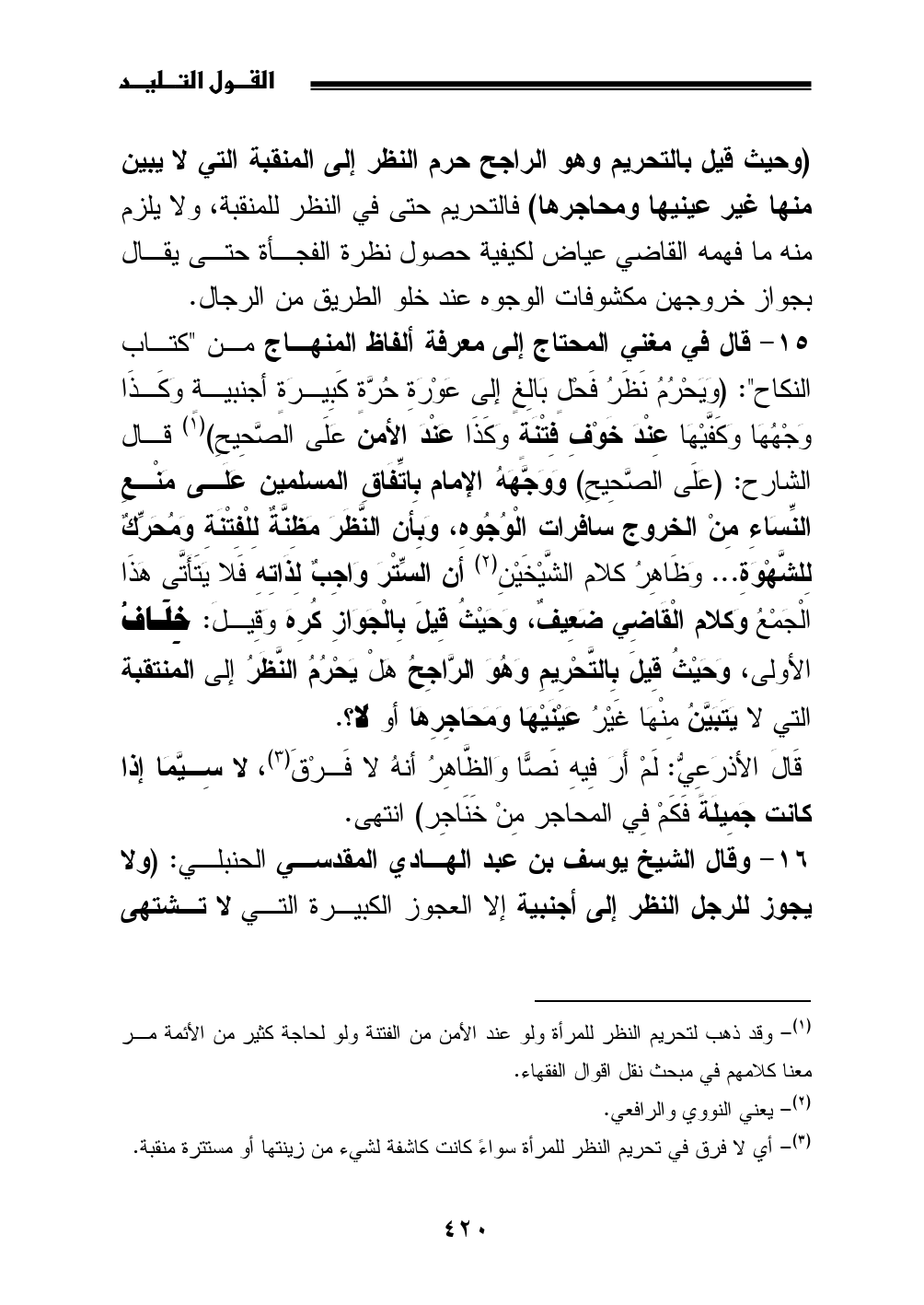 15 - قال في مغني المحتاج إلى معرفة ألفاظ المنهاج من "كتاب النكاح": (وَيَحْرُمُ نَظَرُ فَحْلٍ بَالِغٍ إلى عَوْرَةِ حُرَّةٍ كَبِيرَةٍ أجنبيةٍ وَكَذَا وَجْهُهَا وَكَفَّيْهَا عِنْدَ خَوْفِ فِتْنَةٍ وَكَذَا عَنْدَ الأمن عَلَى الصَّحِيحِ) (¬1) قال الشارح: (عَلَى الصَّحِيحِ) وَوَجَّهَهُ الإمام بِاتِّفَاقِ المسلمين عَلَى مَنْعِ النِّسَاءِ مِنْ الخروج سافرات الْوُجُوهِ، وَبِأن النَّظَرَ مَظِنَّةٌ لِلْفِتْنَةِ وَمُحَرِّكٌ لِلشَّهْوَةِ ... وَظَاهِرُ كلام الشَّيْخَيْنِ (¬2) أن السِّتْرَ وَاجِبٌ لِذَاتِهِ فَلا يَتَأَتَّى هَذَا الْجَمْعُ وَكلام الْقَاضِي ضَعِيفٌ، وَحَيْثُ قِيلَ بِالْجَوَازِ كُرِهَ وَقِيلَ: خِلَافُ الأولى، وَحَيْثُ قِيلَ بِالتَّحْرِيمِ وَهُوَ الرَّاجِحُ هَلْ يَحْرُمُ النَّظَرُ إلى المنتقبة التي لا يَتَبَيَّنُ مِنْهَا غَيْرُ عَيْنَيْهَا وَمَحَاجِرِهَا أو لا؟ .