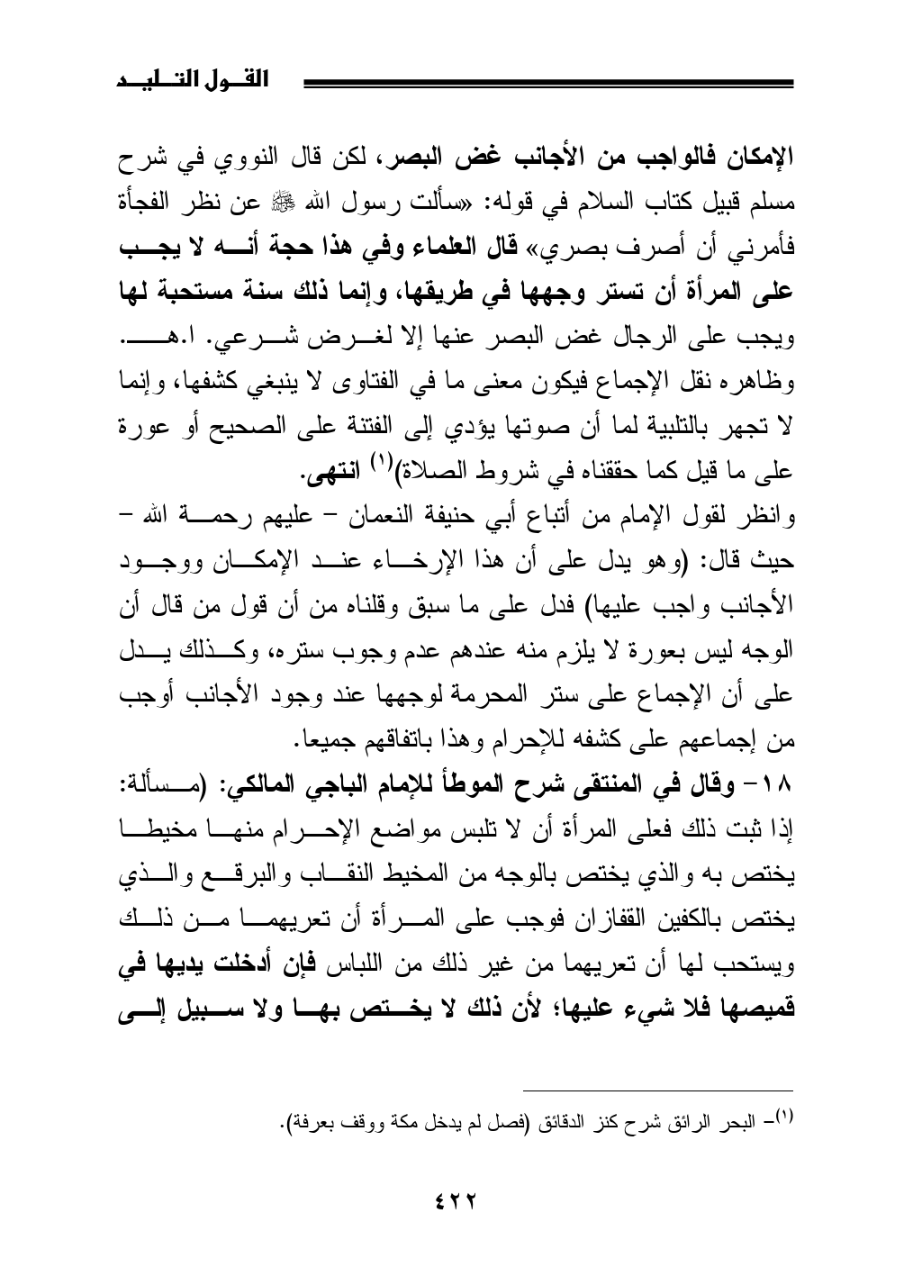 وانظر لقول الإمام من أتباع أبي حنيفة النعمان - عليهم رحمة الله - حيث قال: (وهو يدل على أن هذا الإرخاء عند الإمكان ووجود الأجانب واجب عليها) فدل على ما سبق وقلناه من أن قول من قال أن الوجه ليس بعورة لا يلزم منه عندهم عدم وجوب ستره، وكذلك يدل على أن الإجماع على ستر المحرمة لوجهها عند وجود الأجانب أوجب من إجماعهم على كشفه للإحرام وهذا باتفاقهم جميعا.