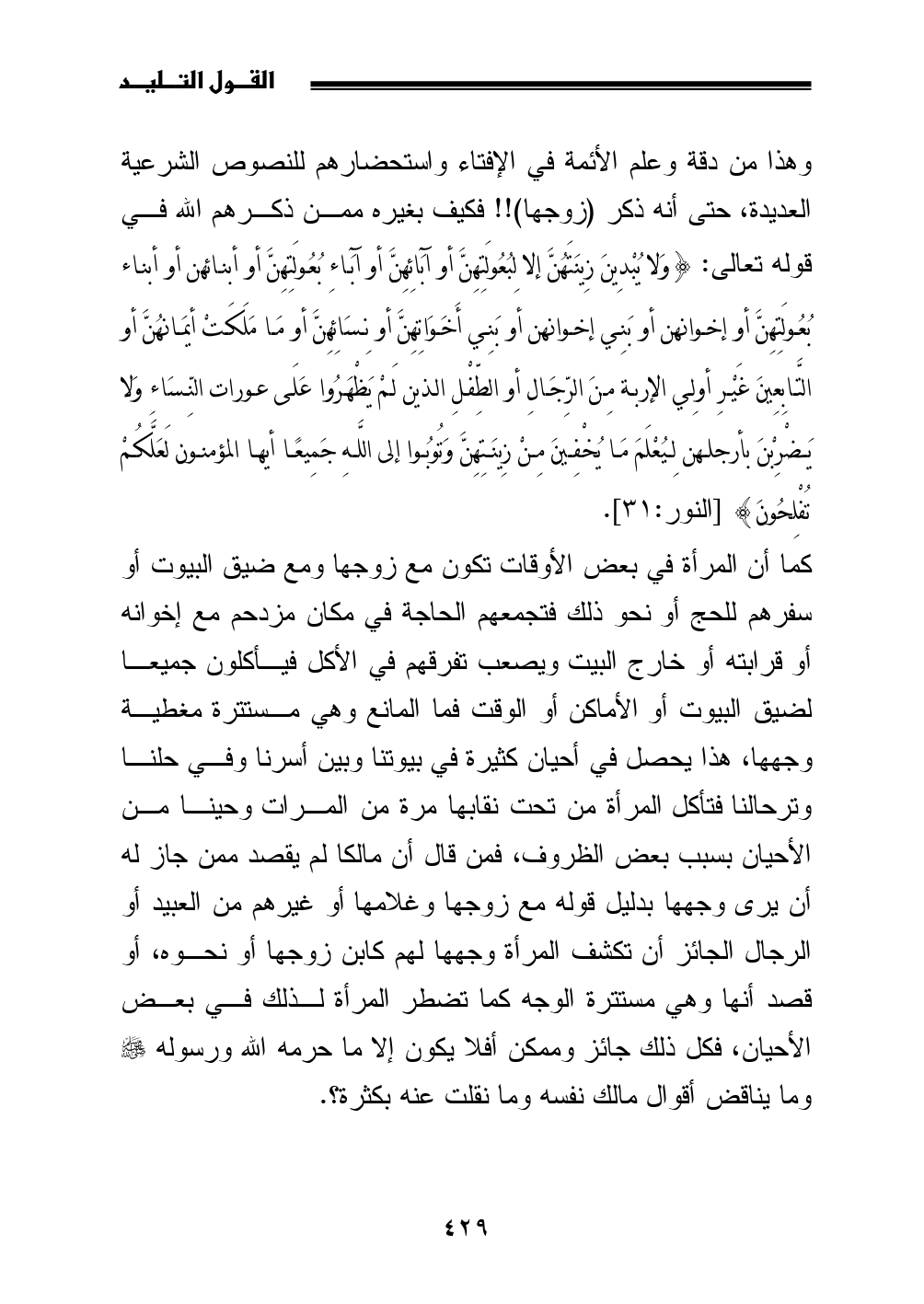 كما أن المرأة في بعض الأوقات تكون مع زوجها ومع ضيق البيوت أو سفرهم للحج أو نحو ذلك فتجمعهم الحاجة في مكان مزدحم مع إخوانه أو قرابته أو خارج البيت ويصعب تفرقهم في الأكل فيأكلون جميعا لضيق البيوت أو الأماكن أو الوقت فما المانع وهي مستترة مغطية وجهها، هذا يحصل في أحيان كثيرة في بيوتنا وبين أسرنا وفي حلنا وترحالنا فتأكل المرأة من تحت نقابها مرة من المرات وحينا من الأحيان بسبب بعض الظروف، فمن قال أن مالكا لم يقصد ممن جاز له أن يرى وجهها بدليل قوله مع زوجها وغلامها أو غيرهم من العبيد أو الرجال الجائز أن تكشف المرأة وجهها لهم كابن زوجها أو نحوه، أو قصد أنها وهي مستترة الوجه كما تضطر المرأة لذلك في بعض الأحيان، فكل ذلك جائز وممكن أفلا يكون إلا ما حرمه الله ورسوله - صلى الله عليه وسلم - وما يناقض أقوال مالك نفسه وما نقلت عنه بكثرة؟ .