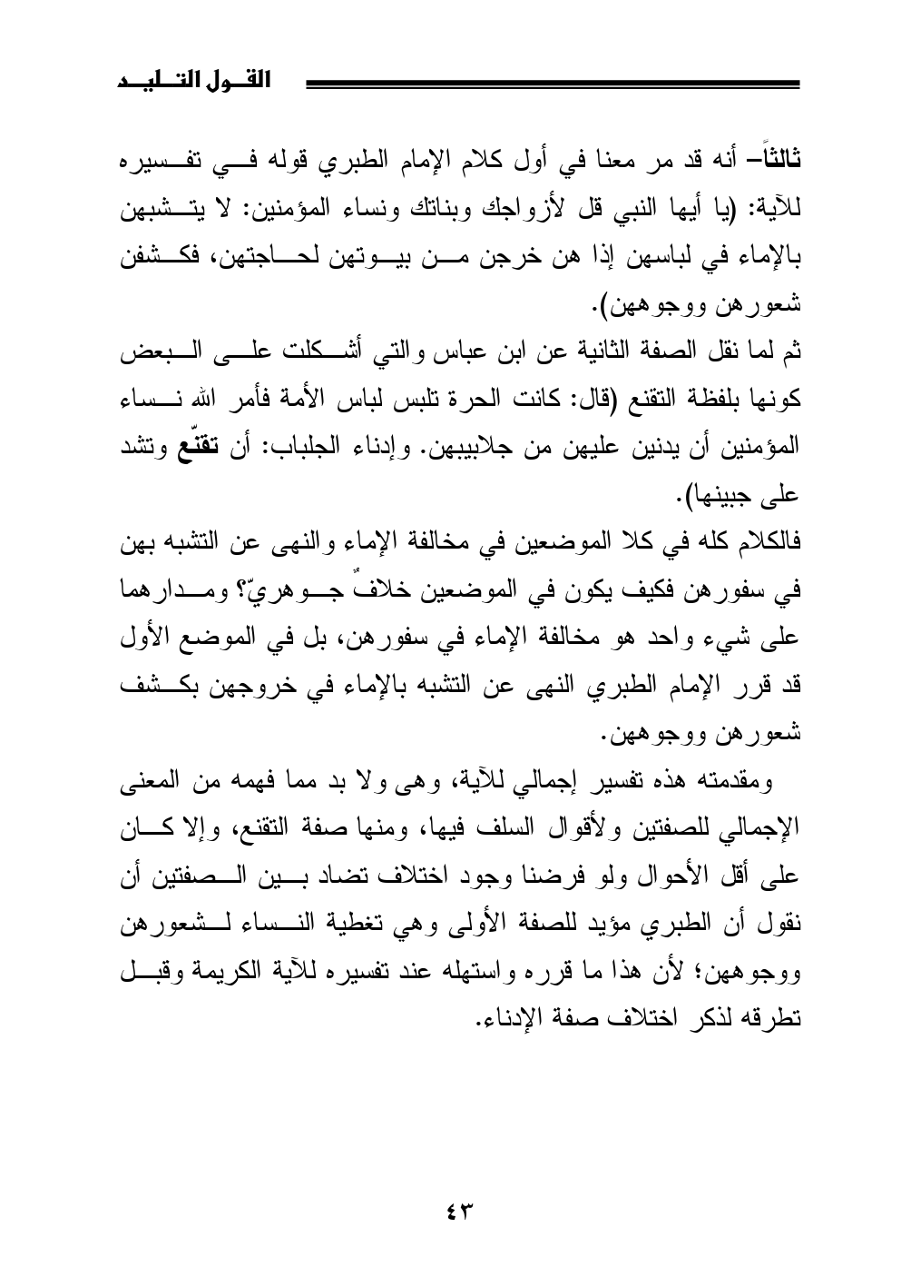 فالكلام كله في كلا الموضعين في مخالفة الإماء والنهى عن التشبه بهن في سفورهن فكيف يكون في الموضعين خلافٌ جوهريّ؟ ومدارهما على شيء واحد هو مخالفة الإماء في سفورهن، بل في الموضع الأول قد قرر الإمام الطبري النهى عن التشبه بالإماء في خروجهن بكشف شعورهن ووجوههن.