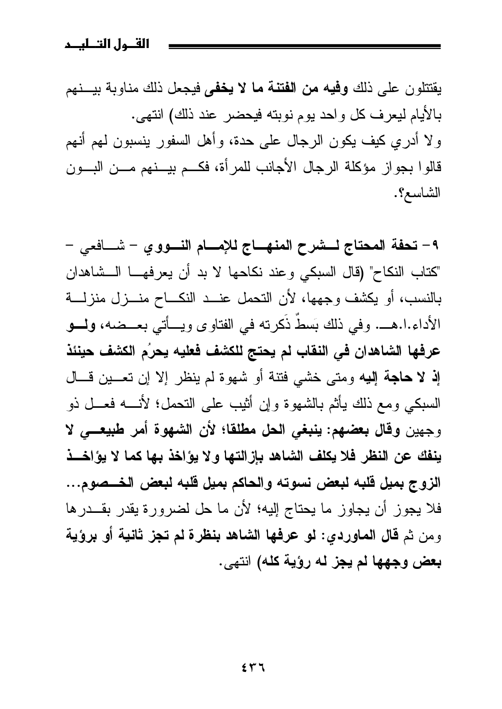 9 - تحفة المحتاج لشرح المنهاج للإمام النووي - شافعي - ... "كتاب النكاح" (قال السبكي وعند نكاحها لا بد أن يعرفها الشاهدان بالنسب، أو يكشف وجهها، لأن التحمل عند النكاح منزل منزلة الأداء. ا. هـ. وفي ذلك بَسطٌ ذَكرته في الفتاوى ويأتي بعضه, ولو عرفها الشاهدان في النقاب لم يحتج للكشف فعليه يحرُم الكشف حينئذ إذ لا حاجة إليه ومتى خشي فتنة أو شهوة لم ينظر إلا إن تعين قال السبكي ومع ذلك يأثم بالشهوة وإن أثيب على التحمل; لأنه فعل ذو وجهين وقال بعضهم: ينبغي الحل مطلقا; لأن الشهوة أمر طبيعي لا ينفك عن النظر فلا يكلف الشاهد بإزالتها ولا يؤاخذ بها كما لا يؤاخذ الزوج بميل قلبه لبعض نسوته والحاكم بميل قلبه لبعض الخصوم ... فلا يجوز أن يجاوز ما يحتاج إليه; لأن ما حل لضرورة يقدر بقدرها ومن ثم قال الماوردي: لو عرفها الشاهد بنظرة لم تجز ثانية أو برؤية بعض وجهها لم يجز له رؤية كله) انتهى.