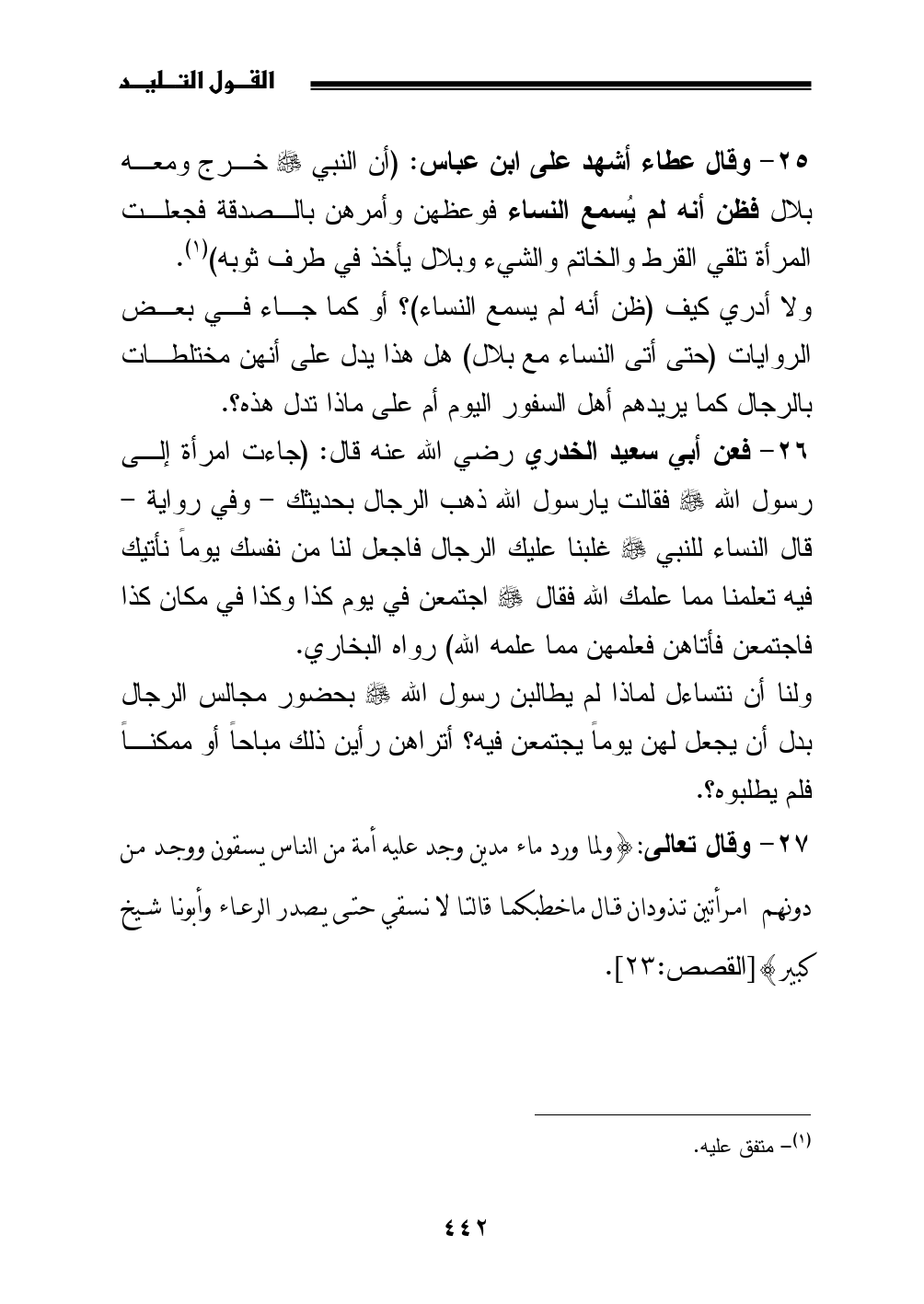 26 - فعن أبي سعيد الخدري رضي الله عنه قال: (جاءت امرأة إلى رسول الله - صلى الله عليه وسلم - فقالت يارسول الله ذهب الرجال بحديثك - وفي رواية - قال النساء للنبي - صلى الله عليه وسلم - غلبنا عليك الرجال فاجعل لنا من نفسك يوماً نأتيك فيه تعلمنا مما علمك الله فقال - صلى الله عليه وسلم - اجتمعن في يوم كذا وكذا في مكان كذا فاجتمعن فأتاهن فعلمهن مما علمه الله) رواه البخاري.