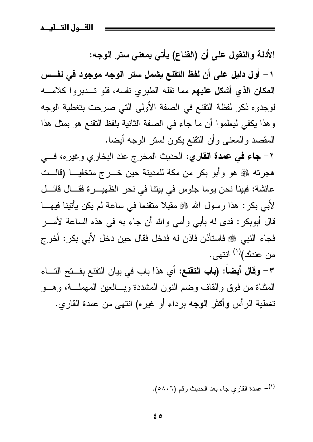 3 - وقال أيضاً: (باب التقنع: أي هذا باب في بيان التقنع بفتح التاء المثناة من فوق والقاف وضم النون المشددة وبالعين المهملة، وهو تغطية الرأس وأكثر الوجه برداء أو غيره) انتهى من عمدة القاري.