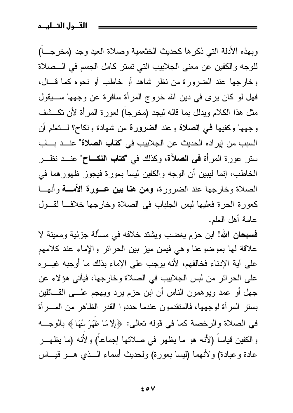 فسبحان الله! ابن حزم يغضب ويشتد خلافه في مسألة جزئية ومعينة لا علاقة لها بموضوعنا وهي فيمن ميز بين الحرائر والإماء عند كلامهم على آية الإدناء فخالفهم، لأنه يوجب على الإماء بذلك ما أوجبه غيره على الحرائر من لبس الجلابيب في الصلاة وخارجها، فيأتي هؤلاء عن جهل أو عمد ويوهمون الناس أن ابن حزم يرد ويهجم على القائلين بستر المرأة لوجهها، فالمتقدمون عندما حددوا القدر الظاهر من المرأة في الصلاة والرخصة كما في قوله تعالى: {إلا مَا ظَهَرَ مِنْهَا} بالوجه والكفين قياساً (لأنه هو ما يظهر في صلاتها إجماعاً) ولأنه (ما يظهر عادة وعبادة) ولأنهما (ليسا بعورة) ولحديث أسماء الذي هو قياس