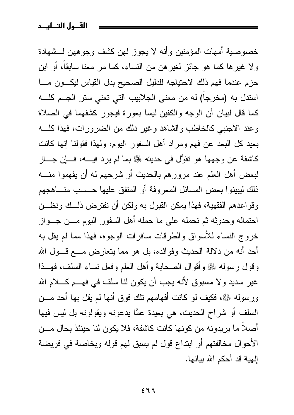 خصوصية أمهات المؤمنين وأنه لا يجوز لهن كشف وجوههن لشهادة ولا غيرها كما هو جائز لغيرهن من النساء، كما مر معنا سابقاً، أو ابن حزم عندما فهم ذلك لاحتياجه للدليل الصحيح بدل القياس ليكون ما استدل به (مخرجاً) له من معنى الجلابيب التي تعني ستر الجسم كله كما قال لبيان أن الوجه والكفين ليسا بعورة فيجوز كشفهما في الصلاة وعند الأجنبي كالخاطب والشاهد وغير ذلك من الضرورات، فهذا كله بعيد كل البعد عن فهم ومراد أهل السفور اليوم، ولهذا فقولنا إنها كانت كاشفة عن وجهها هو تقوُّل في حديثه - صلى الله عليه وسلم - بما لم يرد فيه، فإن جاز لبعض أهل العلم عند مرورهم بالحديث أو شرحهم له أن يفهموا منه ذلك ليبينوا بعض المسائل المعروفة أو المتفق عليها حسب مناهجهم وقواعدهم الفقهية، فهذا يمكن القبول به ولكن أن نفترض ذلك ونظن احتماله وحدوثه ثم نحمله على ما حمله أهل السفور اليوم من جواز خروج النساء للأسواق والطرقات سافرات الوجوه، فهذا مما لم يقل به أحد أنه من دلالة الحديث وفوائده، بل هو مما يتعارض مع قول الله وقول رسوله - صلى الله عليه وسلم - وأقوال الصحابة وأهل العلم وفعل نساء السلف، فهذا غير سديد ولا مسبوق لأنه يجب أن يكون لنا سلف في فهم كلام الله ورسوله - صلى الله عليه وسلم -، فكيف لو كانت أفهامهم تلك فوق أنها لم يقل بها أحد من السلف أو شراح الحديث، هي بعيدة عمَّا يدعونه ويقولونه بل ليس فيها أصلاً ما يريدونه من كونها كانت كاشفة، فلا يكون لنا حينئذ بحال من الأحوال مخالفتهم أو ابتداع قول لم يسبق لهم قوله وبخاصة