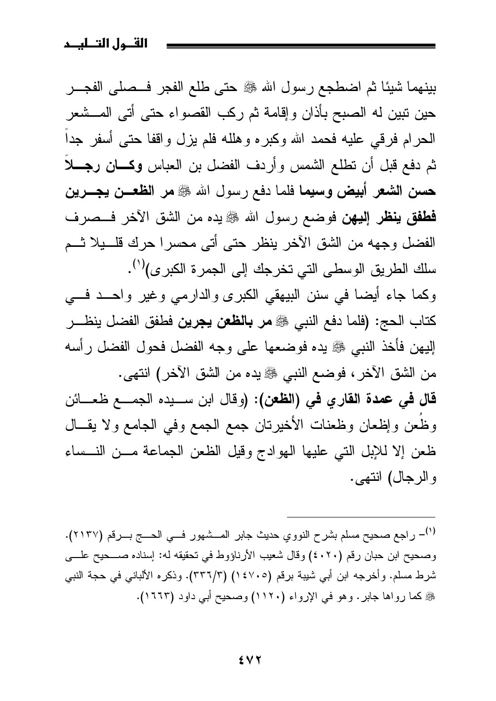(¬1) راجع صحيح مسلم بشرح النووي حديث جابر المشهور في الحج برقم (2137). وصحيح ابن حبان رقم (4020) وقال شعيب الأرناؤوط في تحقيقه له: إسناده صحيح على شرط مسلم. وأخرجه ابن أبي شيبة برقم (14705) (3/ 336). وذكره الألباني في حجة النبي - صلى الله عليه وسلم - كما رواها جابر. وهو في الإرواء (1120) وصحيح أبي داود (1663).