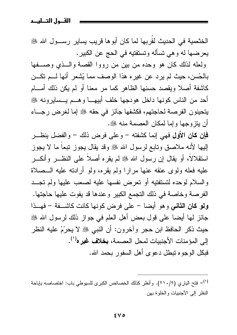 (¬1) فتح الباري (9/ 210). وأنظر كذلك الخصائص الكبرى للسيوطي باب: اختصاصه بإباحة النظر إلى الأجنبيات والخلوة بهن.
