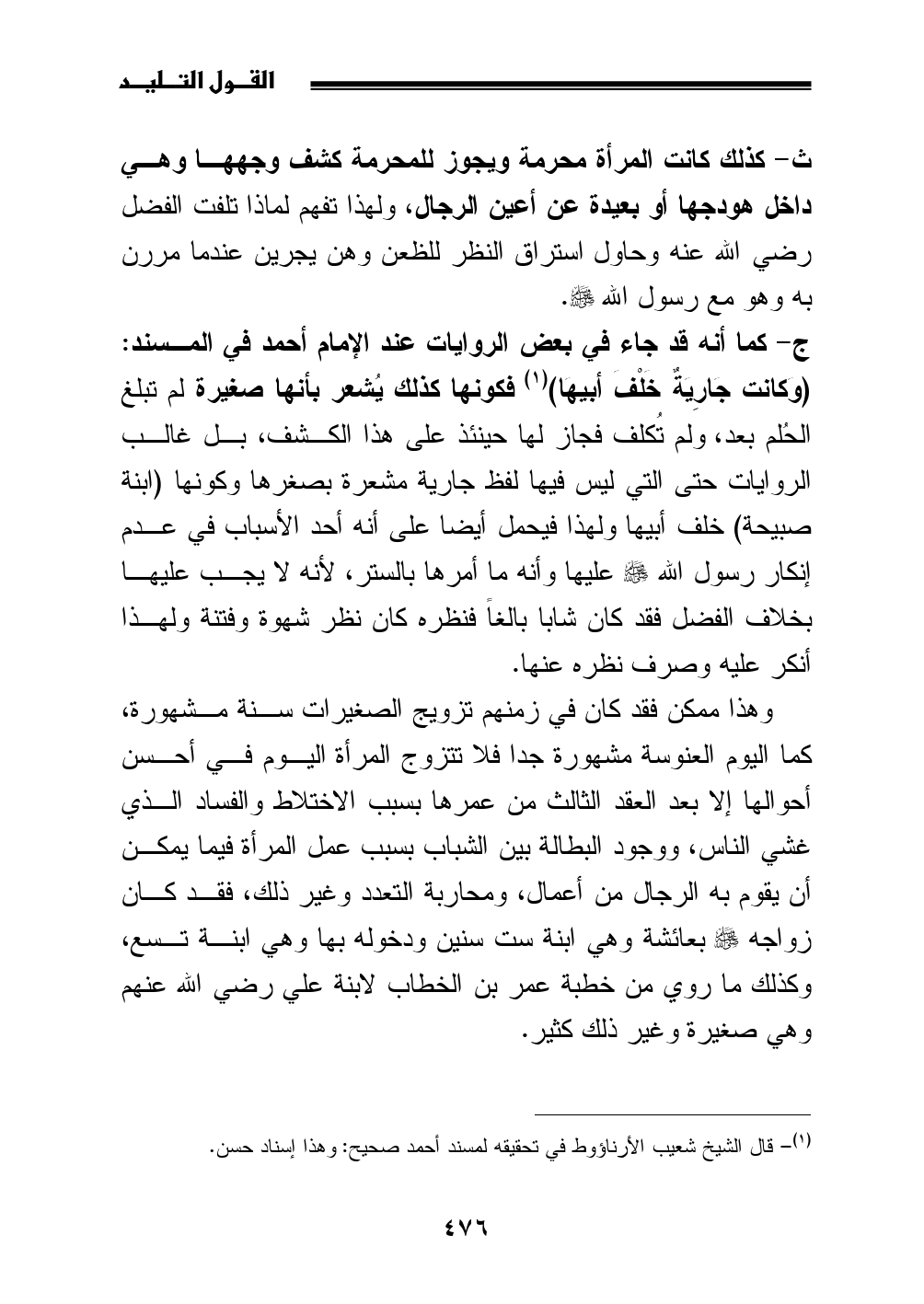 ج- كما أنه قد جاء في بعض الروايات عند الإمام أحمد في المسند: (وَكانت جَارِيَةٌ خَلْفَ أبيهَا) (¬1) فكونها كذلك يُشعر بأنها صغيرة لم تبلغ الحُلم بعد، ولم تُكلف فجاز لها حينئذ على هذا الكشف، بل غالب الروايات حتى التي ليس فيها لفظ جارية مشعرة بصغرها وكونها (ابنة صبيحة) خلف أبيها ولهذا فيحمل أيضا على أنه أحد الأسباب في عدم إنكار رسول الله - صلى الله عليه وسلم - عليها وأنه ما أمرها بالستر، لأنه لا يجب عليها بخلاف الفضل فقد كان شابا بالغاً فنظره كان نظر شهوة وفتنة ولهذا أنكر عليه وصرف نظره عنها.