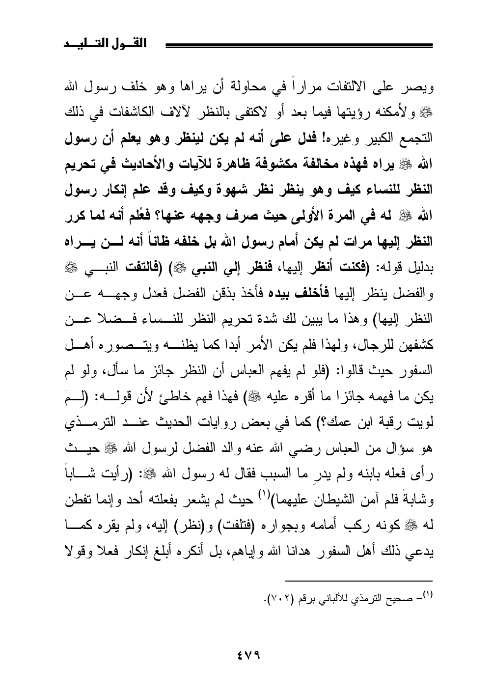 ويصر على الالتفات مراراً في محاولة أن يراها وهو خلف رسول الله - صلى الله عليه وسلم - ولأمكنه رؤيتها فيما بعد أو لاكتفى بالنظر لآلاف الكاشفات في ذلك التجمع الكبير وغيره! فدل على أنه لم يكن لينظر وهو يعلم أن رسول الله - صلى الله عليه وسلم - يراه فهذه مخالفة مكشوفة ظاهرة للآيات والأحاديث في تحريم النظر للنساء كيف وهو ينظر نظر شهوة وكيف وقد علم إنكار رسول الله - صلى الله عليه وسلم - له في المرة الأولى حيث صرف وجهه عنها؟ فعُلم أنه لما كرر النظر إليها مرات لم يكن أمام رسول الله بل خلفه ظاناً أنه لن يراه بدليل قوله: (فكنت أنظر إليها، فنظر إلي النبي - صلى الله عليه وسلم -) (فالتفت النبي - صلى الله عليه وسلم - والفضل ينظر إليها فأخلف بيده فأخذ بذقن الفضل فعدل وجهه عن النظر إليها) وهذا ما يبين لك شدة تحريم النظر للنساء فضلا عن كشفهن للرجال، ولهذا فلم يكن الأمر أبدا كما يظنه ويتصوره أهل السفور حيث قالوا: (فلو لم يفهم العباس أن النظر جائز ما سأل، ولو لم يكن ما فهمه جائزا ما أقره عليه - صلى الله عليه وسلم -) فهذا فهم خاطئ لأن قوله: (لِمَ لويت رقبة ابن عمك؟ ) كما في بعض روايات الحديث عند الترمذي هو سؤال من العباس رضي الله عنه والد الفضل لرسول الله - صلى الله عليه وسلم - حيث رأى فعله بابنه ولم يدرِ ما السبب فقال له رسول الله - صلى الله عليه وسلم -: (رأيت شاباً وشابةً فلم آمن الشيطان عليهما) (¬1) حيث لم يشعر بفعلته أحد وإنما تفطن له - صلى الله عليه وسلم - كونه ركب أمامه وبجواره (فتلفت) و (نظر) إليه، ولم يقره كما يدعي ذلك أهل السفور هدانا الله وإياهم، بل أنكره أبلغ إنكار فعلا وقولا