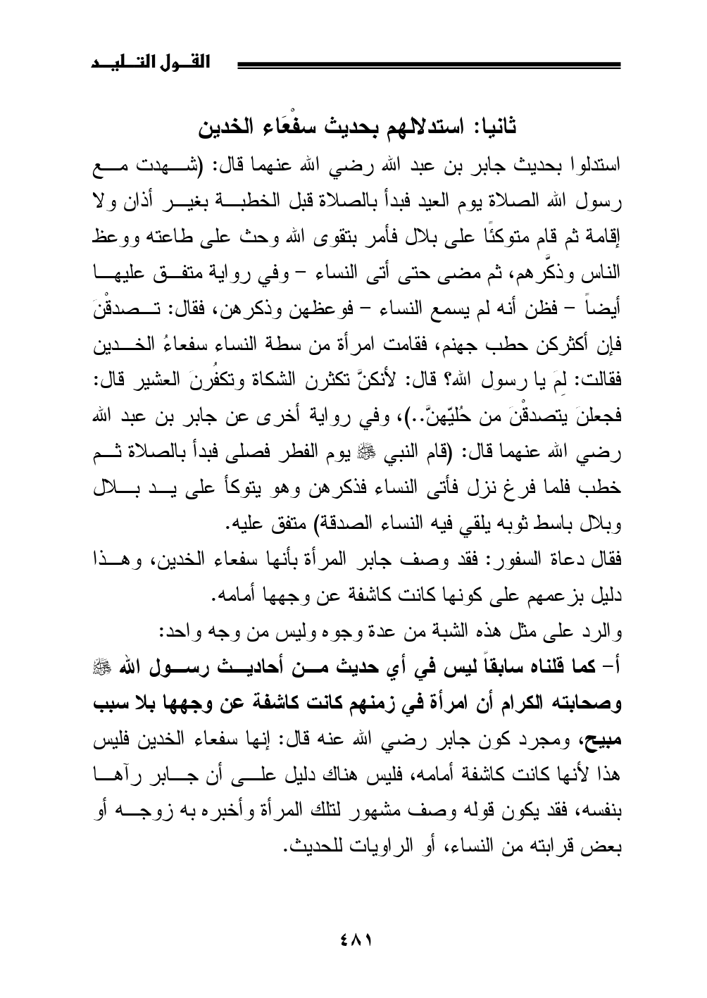 أ- كما قلناه سابقاً ليس في أي حديث من أحاديث رسول الله - صلى الله عليه وسلم - وصحابته الكرام أن امرأة في زمنهم كانت كاشفة عن وجهها بلا سبب مبيح، ومجرد كون جابر رضي الله عنه قال: إنها سفعاء الخدين فليس هذا لأنها كانت كاشفة أمامه، فليس هناك دليل على أن جابر رآها بنفسه، فقد يكون قوله وصف مشهور لتلك المرأة وأخبره به زوجه أو بعض قرابته من النساء، أو الراويات للحديث.