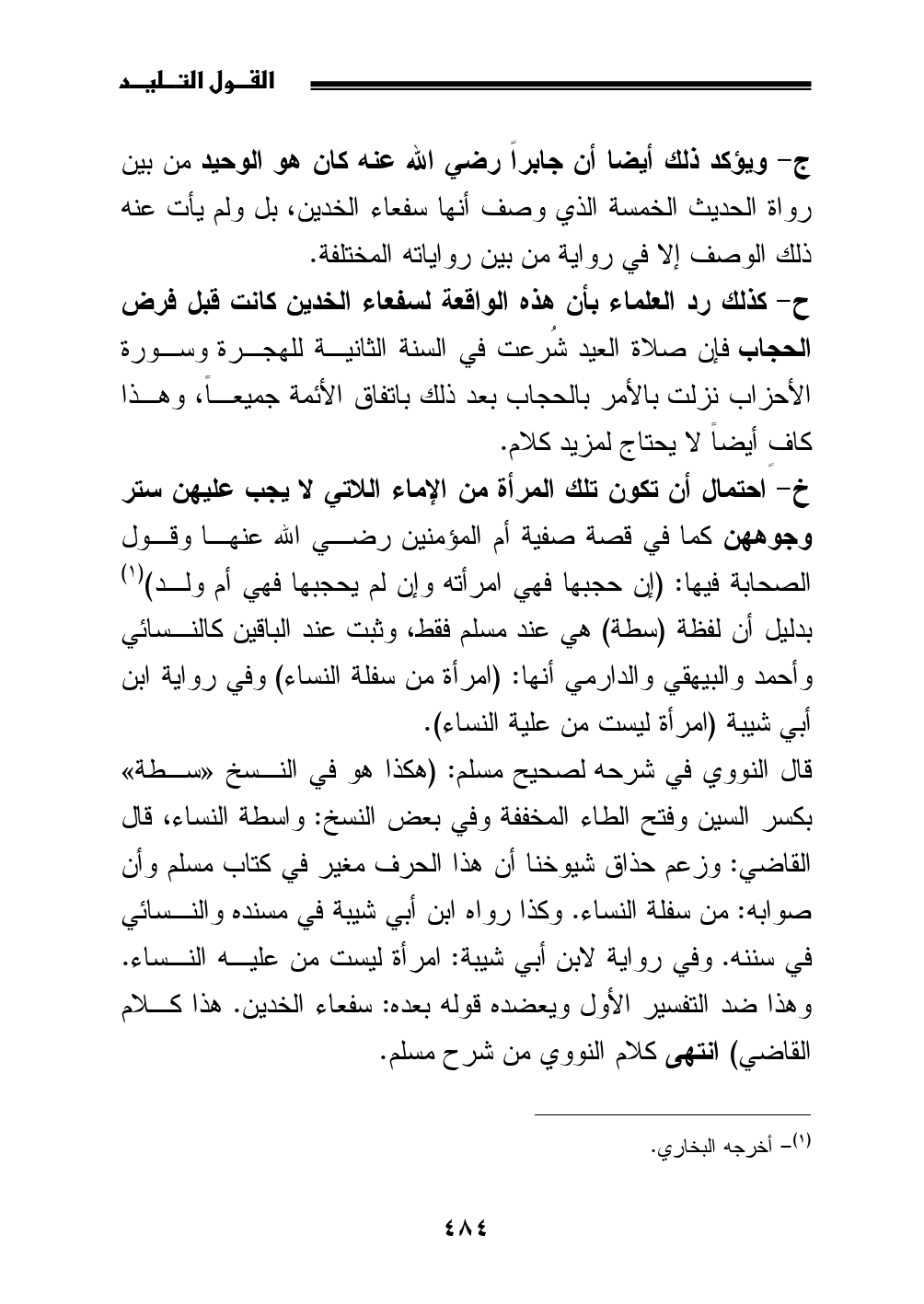 خ- احتمال أن تكون تلك المرأة من الإماء اللاتي لا يجب عليهن ستر وجوههن كما في قصة صفية أم المؤمنين رضي الله عنها وقول الصحابة فيها: (إن حجبها فهي امرأته وإن لم يحجبها فهي أم ولد) (¬1) بدليل أن لفظة (سطة) هي عند مسلم فقط، وثبت عند الباقين كالنسائي وأحمد والبيهقي والدارمي أنها: (امرأة من سفلة النساء) وفي رواية ابن أبي شيبة (امرأة ليست من علية النساء).