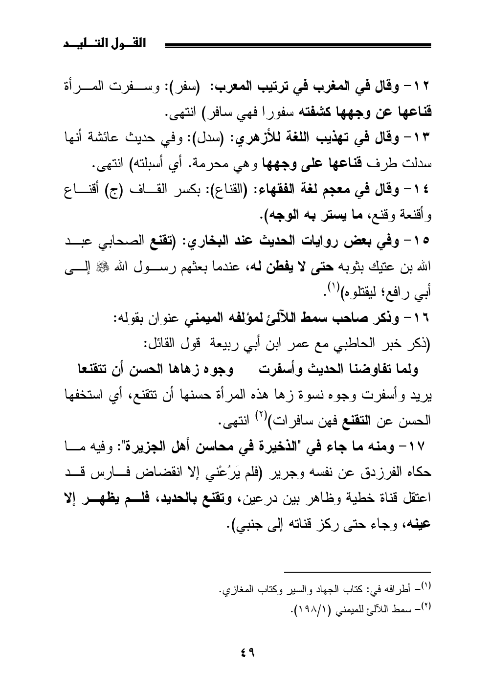 12 - وقال في المغرب في ترتيب المعرب: (سفر): وسفرت المرأة قناعها عن وجهها كشفته سفورا فهي سافر) انتهى.