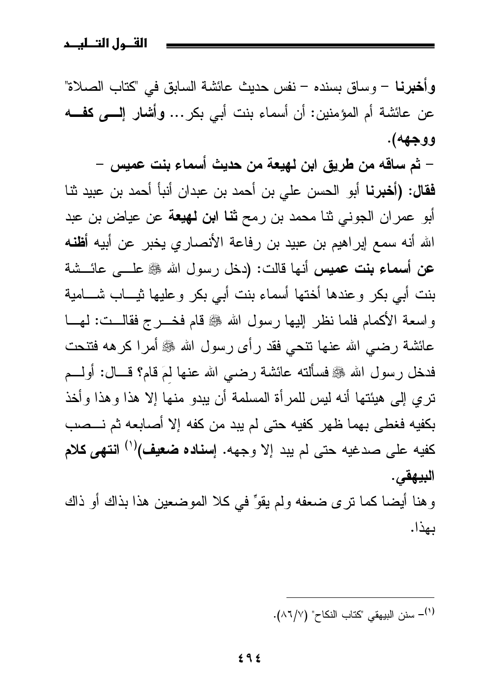 فقال: (أخبرنا أبو الحسن علي بن أحمد بن عبدان أنبأ أحمد بن عبيد ثنا أبو عمران الجوني ثنا محمد بن رمح ثنا ابن لهيعة عن عياض بن عبد الله أنه سمع إبراهيم بن عبيد بن رفاعة الأنصاري يخبر عن أبيه أظنه عن أسماء بنت عميس أنها قالت: (دخل رسول الله - صلى الله عليه وسلم - على عائشة بنت أبي بكر وعندها أختها أسماء بنت أبي بكر وعليها ثياب شامية واسعة الأكمام فلما نظر إليها رسول الله - صلى الله عليه وسلم - قام فخرج فقالت: لها عائشة رضي الله عنها تنحي فقد رأى رسول الله - صلى الله عليه وسلم - أمرا كرهه فتنحت فدخل رسول الله - صلى الله عليه وسلم - فسألته عائشة رضي الله عنها لِمَ قام؟ قال: أولم تري إلى هيئتها أنه ليس للمرأة المسلمة أن يبدو منها إلا هذا وهذا وأخذ بكفيه فغطى بهما ظهر كفيه حتى لم يبد من كفه إلا أصابعه ثم نصب كفيه على صدغيه حتى لم يبد إلا وجهه. إسناده ضعيف) (¬1) انتهى كلام البيهقي.