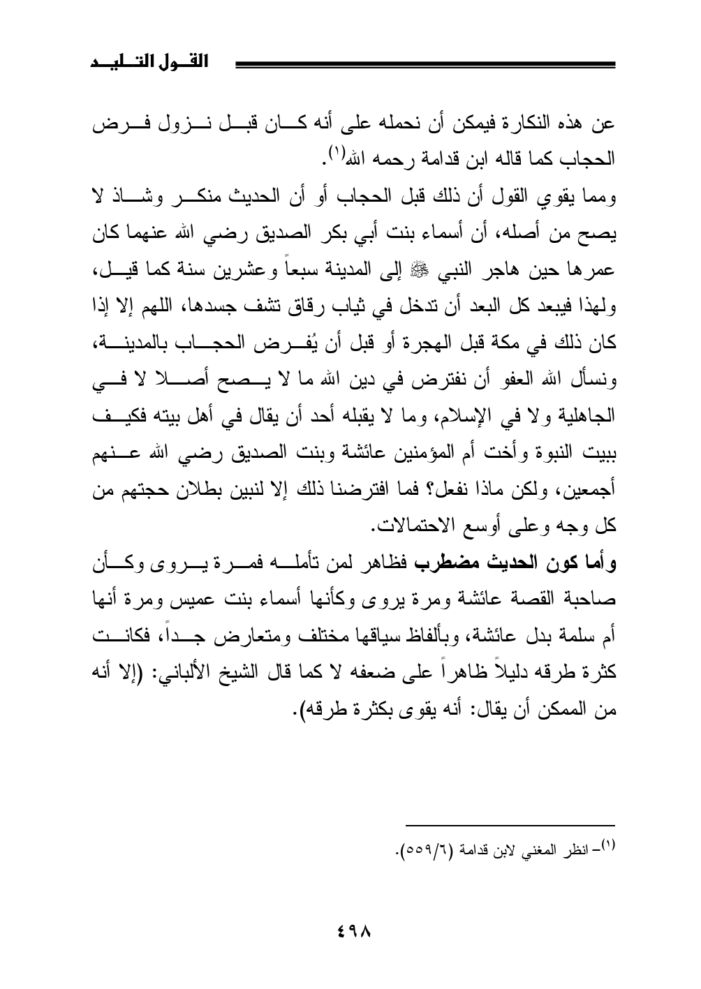 عن هذه النكارة فيمكن أن نحمله على أنه كان قبل نزول فرض الحجاب كما قاله ابن قدامة رحمه الله (¬1).