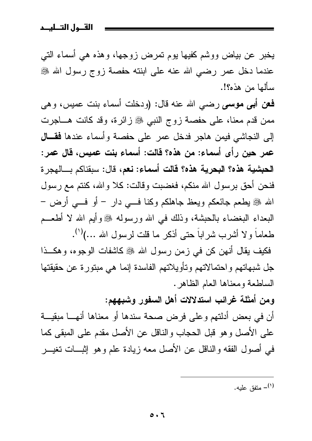 فعن أبى موسى رضي الله عنه قال: (ودخلت أسماء بنت عميس، وهى ممن قدم معنا، على حفصة زوج النبي - صلى الله عليه وسلم - زائرة، وقد كانت هاجرت إلى النجاشي فيمن هاجر فدخل عمر على حفصة وأسماء عندها فقال عمر حين رأى أسماء: من هذه؟ قالت: أسماء بنت عميس، قال عمر: الحبشية هذه؟ البحرية هذه؟ قالت أسماء: نعم، قال: سبقناكم بالهجرة فنحن أحق برسول الله منكم، فغضبت وقالت: كلا والله، كنتم مع رسول الله - صلى الله عليه وسلم - يطعم جائعكم ويعظ جاهلكم وكنا في دار - أو في أرض - البعداء البغضاء بالحبشة، وذلك في الله ورسوله - صلى الله عليه وسلم - وأيم الله لا أطعم طعاماً ولا أشرب شراباً حتى أذكر ما قلت لرسول الله ... ) (¬1).